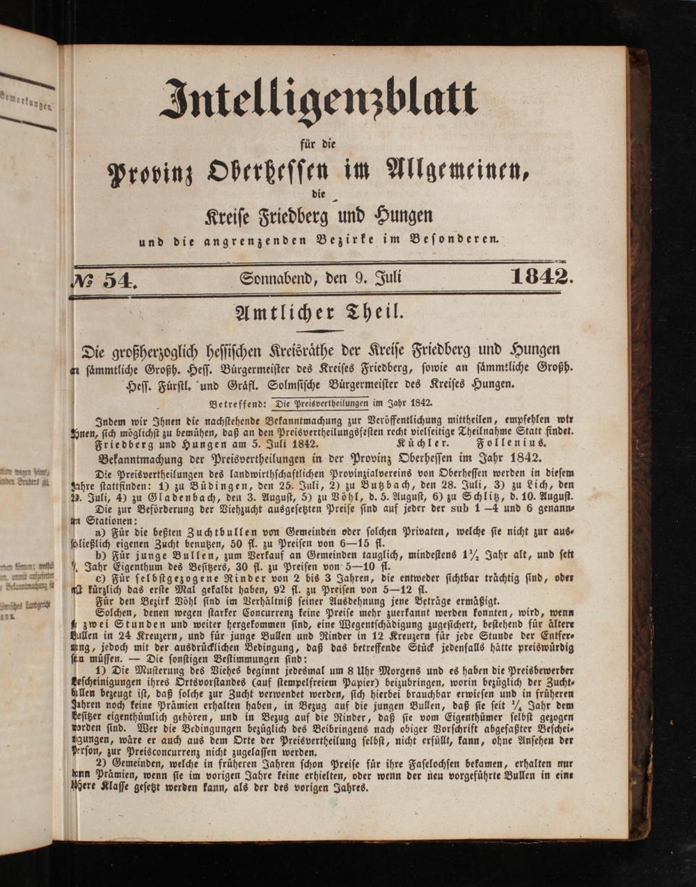 für die Provinz Oberbeſſen im Allgemeinen, die Kreiſe Friedberg und Hungen und die angrenzenden Bezirke im Beſonderen. M 54. Sonnabend, den 9. Juli 1842.