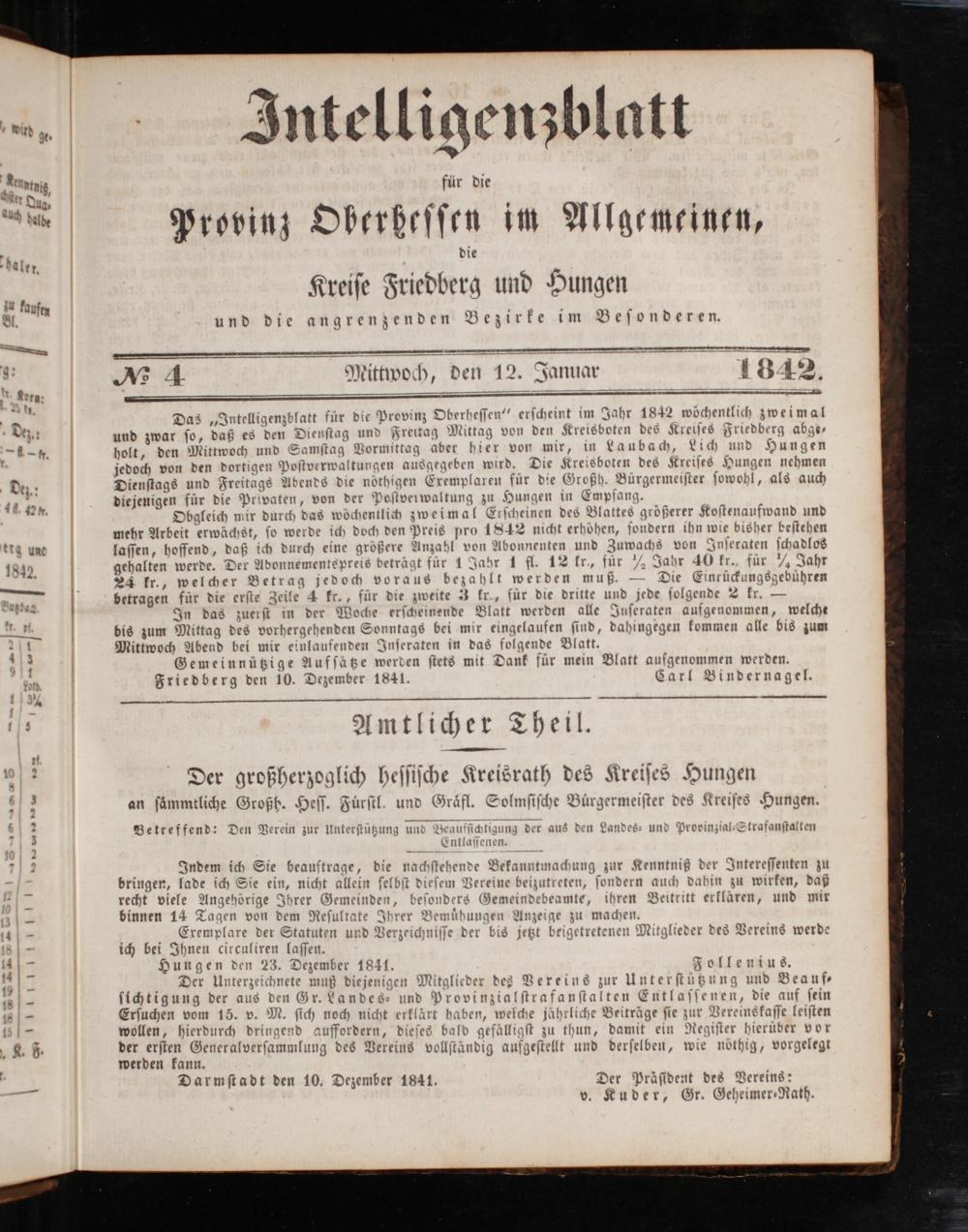 Das„Intelligenzblatt für die Provinz Oberheſſen“ erſcheint im Jahr 1842 wöchentlich zweimal und zwar ſo, daß es den Dienſtag und Freitag Mittag von den Kreisboten des Kreiſes Friedberg abge— holt, den Mittwoch und Samſtag Vormittag aber hier von mir, in Laubach, Lich und Hungen jedoch von den dortigen Poſtverwaltungen ausgegeben wird. Die Kreisboten des Kreiſes Hungen nehmen Dienſtags und Freitags Abends die nöthigen Exemplaren für die Großh. Bürgermeiſter ſowohl, als auch diejenigen für die Privaten, von der Poſtverwaltung zu Hungen in Empfang.