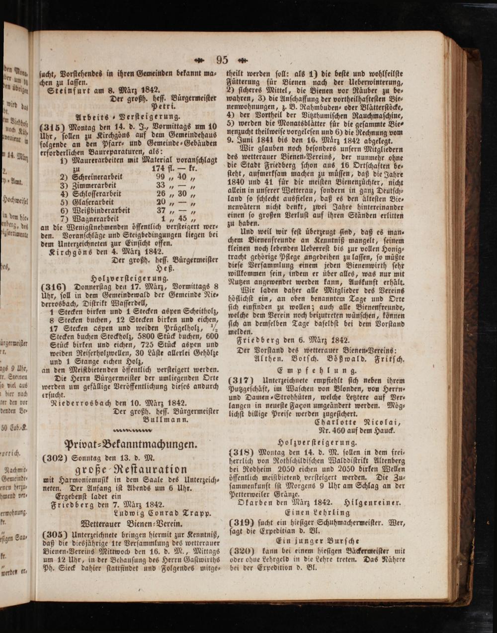 große Reſtauration mit Harmoniemuſik in dem Saale des Unterzeich⸗ neten. Der Anfang iſt Abends um 6 Uhr. Ergebenſt ladet ein Friedberg den 7. März 1842. Ludwig Conrad Trapp. Wetterauer Bienen⸗ Verein. (305) Unterzeichnete bringen hiermit zur Kenntniß, daß die diesjährige ite Verſammlung des wetterauer Bienen⸗Vereins Mittwoch den 16. d. M., Mittags um 12 Uhr, in der Behauſung des Herrn Gaſtwirths Ph. Sieck dahier ſtattfindet und Folgendes mitge⸗