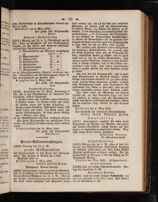 theilt werden ſoll: als 1) die beſte und wohlfeilſte Fütterung für Bienen nach der Ueberwinterung, N ſicheres Mittel, die Bienen vor Räuber zu be⸗ wahren, 3) die Anſchaffung der vortheilhafteſten Bie⸗ nenwohnungen, z. B. Rahmbuden⸗- oder Blätterſtöcke, 4) der Vortheil der Vitzthumiſchen Rauchmaſchine, 5) werden die Monatsblätter für die geſammte Bie⸗ nenzucht theilweiſe vorgeleſen und 6) die Rechnung vom 9. Juni 1841 bis den 16. Maͤrz 1842 abgelegt.
