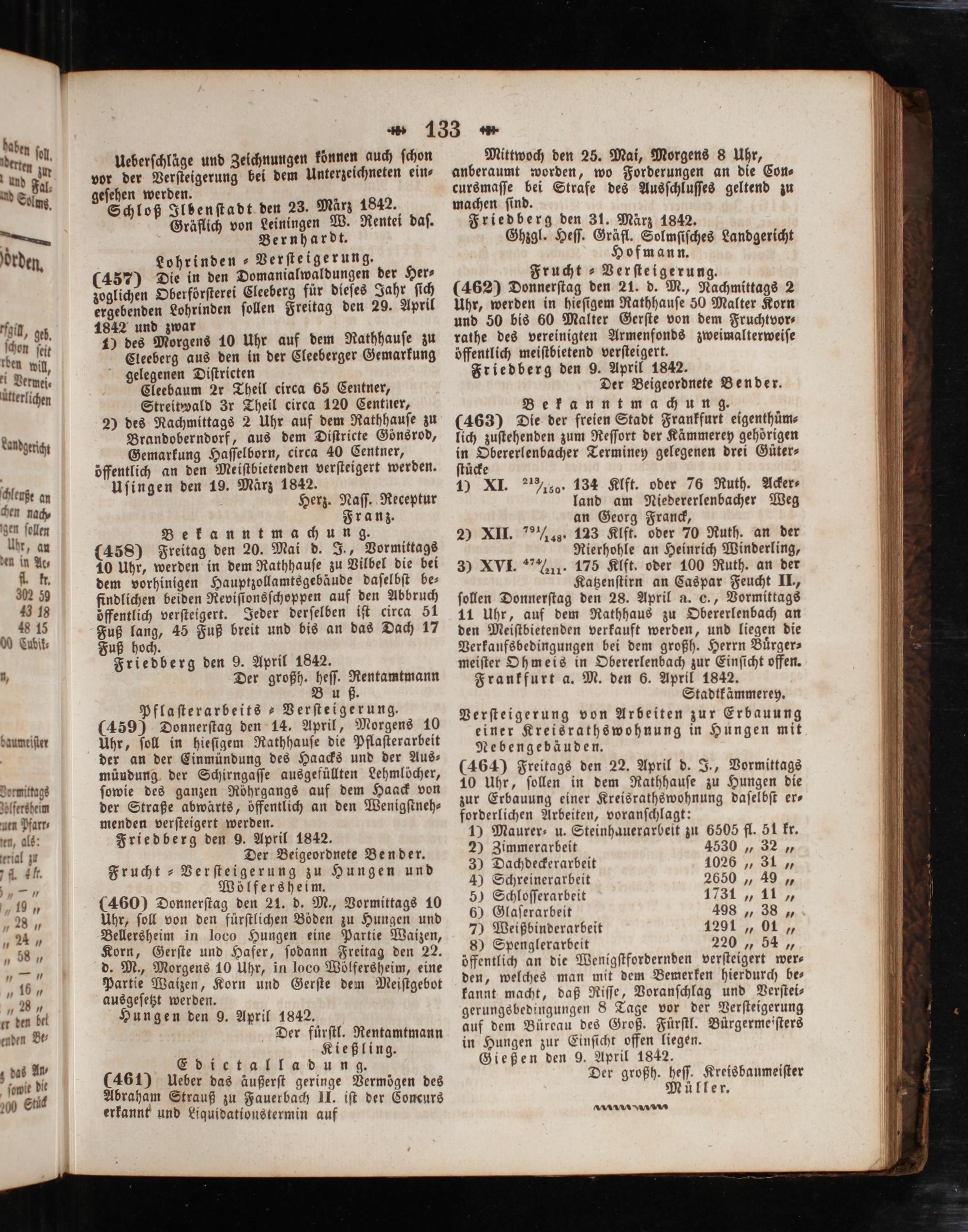 Friedberg den 31. März 1842. Ghzgl. Heſſ. Gräfl. Solmſiſches Landgericht of mann. Frucht ⸗Verſteigerung. (462) Donnerſtag den 21. d. M., Nachmittags 2 Uhr, werden in hieſigem Rathhauſe 50 Malter Korn und 50 bis 60 Malter Gerſte von dem Fruchtvor⸗ rathe des vereinigten Armenfonds zweimalterweiſe oͤffentlich meiſtbietend verſteigert. Friedberg den 9. April 1842. Der Beigeordnete Bender. Bekanntmachung. (463) Die der freien Stadt Frankfurt eigenthüm⸗ lich zuſtehenden zum Reſſort der Kämmerey gehörigen in Obererlenbacher Terminey gelegenen drei Guͤter⸗ ſtůcke 1) XI. ½80. 134 Klft. oder 76 Ruth. Acker⸗ land am Niedererlenbacher Weg an Georg Franck, 20 XII.%¼s. 123 Klft. oder 70 Ruth. an der Rierhohle an Heinrich Winderling, 3) XVI. 1. 175 Klft. oder 100 Ruth. an der Katzenſtirn an Caspar Feucht II., ſollen Donnerſtag den 28. April a. c., Vormittags 11 Uhr, auf dem Rathhaus zu Obererlenbach an den Meiſtbietenden verkauft werden, und liegen die Verkaufsbedingungen bei dem großh. Herrn Buͤrger— meiſter Ohmeis in Obererlenbach zur Einſicht offen. Frankfurt a. M. den 6. April 1842. Stadtkämmerey. Verſteigerung von Arbeiten zur Erbauung einer Kreisrathswohnung in Hungen mit Nebengebäuden. (464) Freitags den 22. April d. J., Vormittags 10 Uhr, ſollen in dem Rathhauſe zu Hungen die zur Erbauung einer Kreisrathswohnung daſelbſt er— forderlichen Arbeiten, voranſchlagt: 1) Maurer- u. Steinhauerarbeit zu 6505 fl. 51 kr. 2) Zimmerarbeit 4530„ 32„ 3) Dachdeckerarbeit 4) Schreinerarbeit 5) Schloſſerarbeit