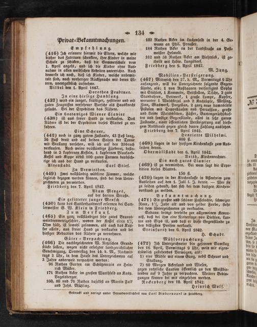 M. Jung. Mobilien-Verſteigerung. (467) Mittwoch den 27. d. M., Vormittags 9 Uhr anfangend, will die Unterzeichnete folgende Gegen⸗ ſtände, als: 1 von Roßhaaren verfertigtes Sopha mit Stühlen, 1 Kommode, Bettſtellen, Tiſche, 2 gute Standuhren, Bettwerk, 1 große Lampe, Kupfer, worunter 1 Waſchkeſſel und 2 Kochtöpfe, Meſſing, Zinn, Glaswerk, Porzellan, 2 ganz neue damascirte Piſtolen mit Doppelläufen und Percuſſion, große und kleine Waſchbuͤtten, Fäſſer, Gartengeräthſchaf⸗ ten und ſonſtige Gegenſtände, alles in ſebr gutem Zuſtande, einer öffentlichen Verſteigerung auf hieſi⸗ gem Rathhauſe gegen gleich baare Zahlung ausſetzen. Friedberg den 7. April 1842. Henriette Wilhelmi. 400 fl. (468) liegen in der hieſigen Kirchenkaſſe zum Aus⸗ leihen bereit. Oberwöllſtadt den 6. April 1842. Veith, Kirchenrechner. Ein noch gutes Clavier (469) iſt zu vermiethen. Bei wem ſagt die Expe⸗ dition dieſes Blattes. 150 fl.
