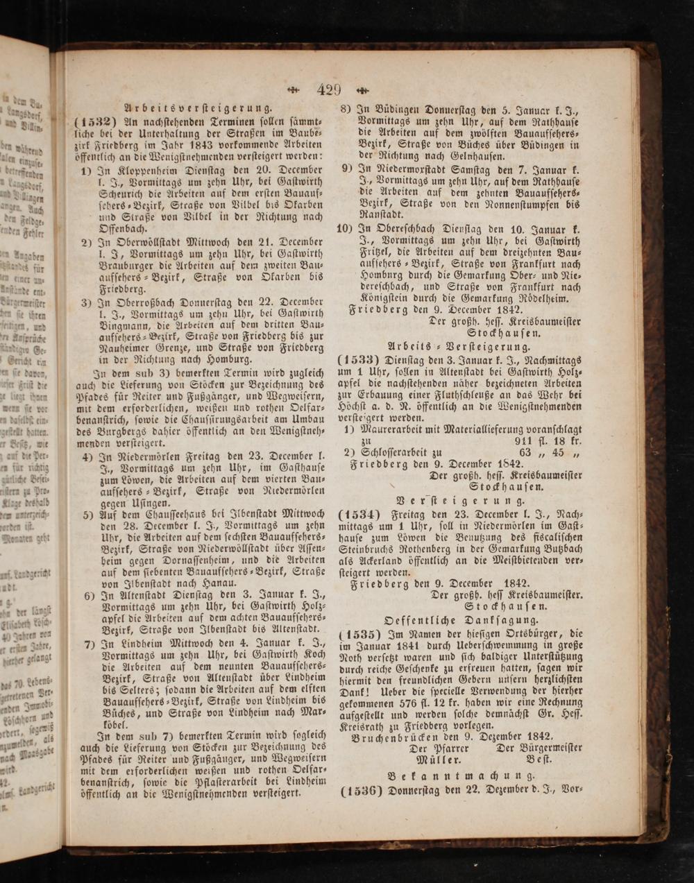 2) In Oberwoͤllſtadt Mittwoch den 21. December J. J, Vormittags um zehn Uhr, bei Gaſtwirth Brauburger die Arbeiten auf dem zweiten Bau— aufſehers-Bezirk, Straße von Okarben bis Friedberg.