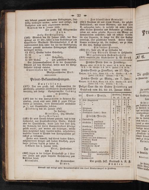 Polizei⸗Taxe fur die Staͤdte Friedberg und Butzbach vom 16. bis 23. Januar 1842.