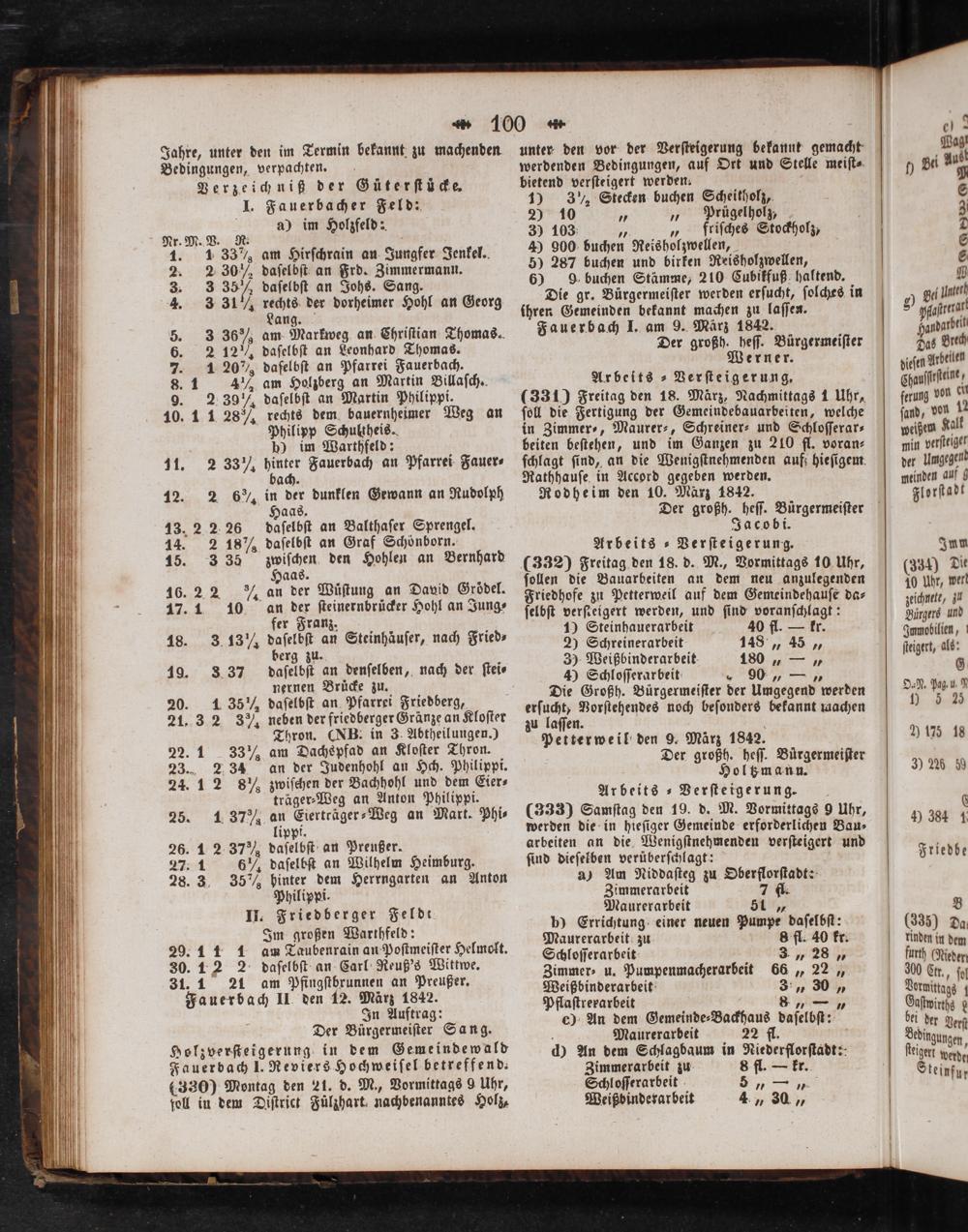 unter den vor der Verſteigerung bekannt gemacht werdenden Bedingungen, auf Ort und Stelle meiſt⸗ bietend verſteigert werden. 1) 3½ Stecken buchen Scheitholz, 2 10 7„, Prügelholz, 3) 103 75„ friſches Stockholz, 4) 900 buchen Reisholzwellen, 5) 287 buchen und birken Reisholzwellen, 6) 9 buchen Stämme, 210 Cubikfuß haltend. Die gr. Bürgermeiſter werden erſucht, ſolches in ihren Gemeinden bekannt machen zu laſſen. Fauerbach I. am 9. März 1842. Der großh. heſſ. Bürgermeiſter Werner. Arbeits ⸗Verſteigerung. (331) Freitag den 18. März, Nachmittags 1 Uhr, ſoll die Fertigung der Gemeindebauarbeiten, welche in Zimmer-, Maurer-, Schreiner⸗ und Schloſſerar⸗ beiten beſtehen, und im Ganzen zu 210 fl. voran⸗ ſchlagt ſind, an die Wenigſtnehmenden auf hieſigem Rathhauſe in Accord gegeben werden. Rodheim den 10. März 1842. Der großh. heſſ. Bürgermeiſter Jacobi. Arbeits ⸗Verſteigerung. (332) Freitag den 18. d. M., Vormittags 10 Uhr, ſollen die Bauarbeiten an dem neu anzulegenden Friedhofe zu Petterweil auf dem Gemeindehauſe da⸗ ſelbſt verſteigert werden, und ſind voranſchlagt: