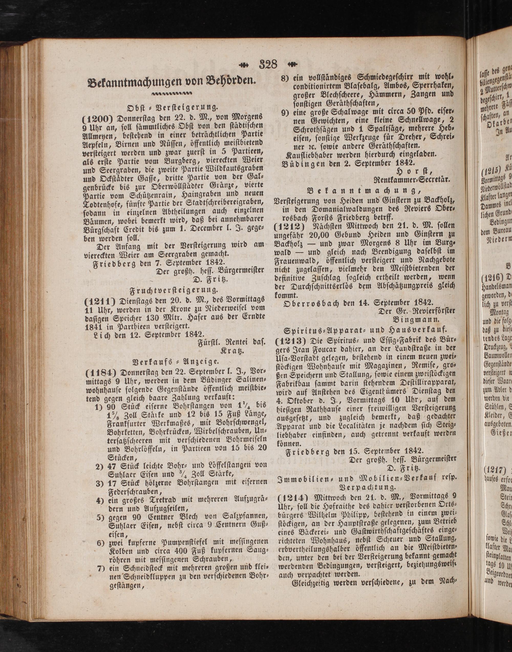 Kaufliebhaber werden hierdurch eingeladen. Büdingen den 2. September 1842. Ho r ſt, Rentkammer⸗Secretär. Bekanntmachung, Verſteigerung von Heiden und Ginſtern zu Backholz, in den Domanialwaldungen des Reviers Ober— rosbach Forſts Friedberg berrff. (1212) Nächſten Mittwoch den 21. d. M. ſollen ungefähr 20,00 Gebund Heiden und Ginſtern zu Backholz— und zwar Morgens 8 Uhr im Burg⸗ wald— und gleich nach Beendigung daſelbſt im Frauenwald, öffentlich verſteigert und Nachgebote nicht zugelaſſen, vielmehr den Meiſtbietenden der definitive Zuſchlag ſogleich ertheilt werden, wenn 05 Durchſchnittserlös dem Abſchaͤtzungpreis gleich ommt.