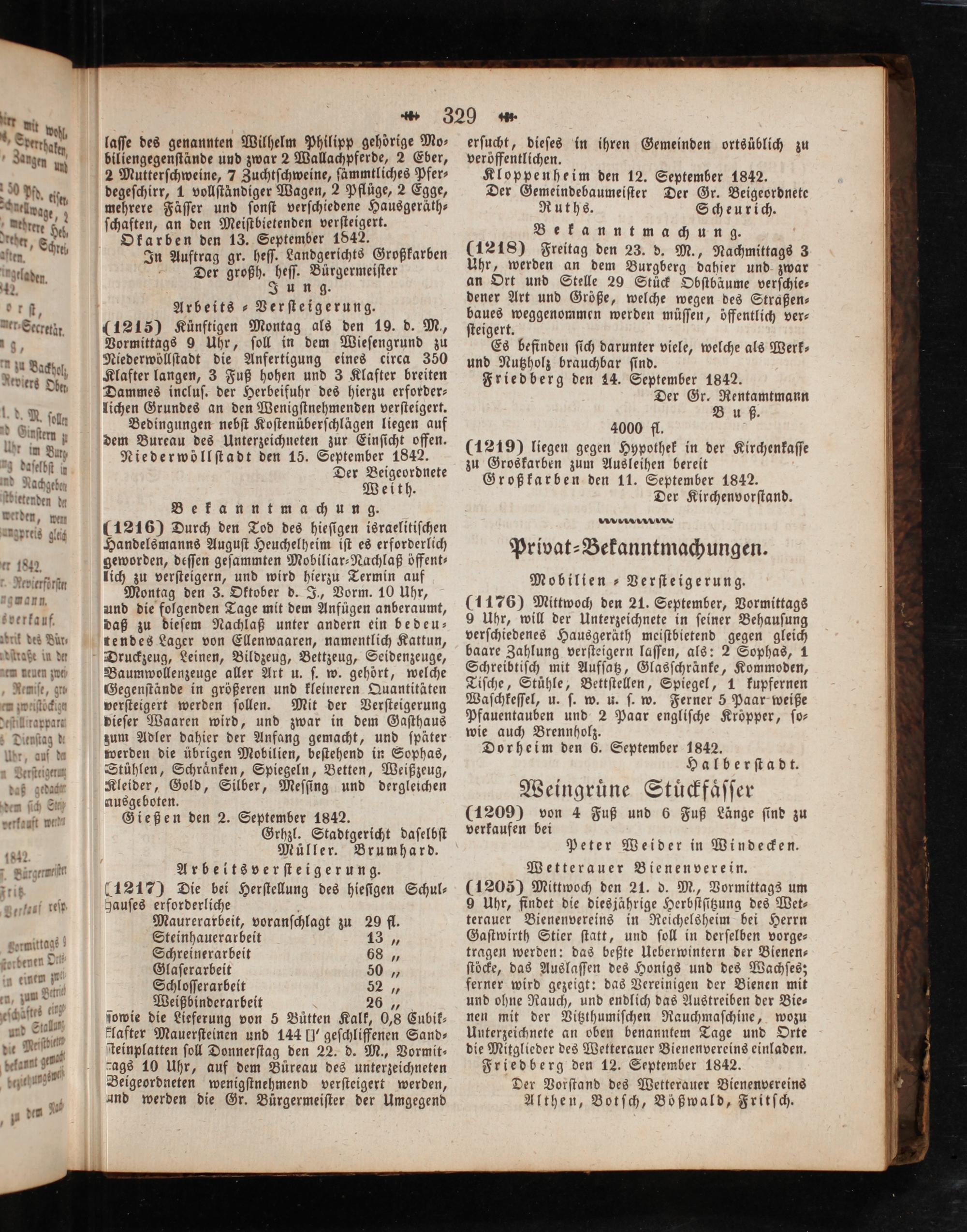 (1215) Künftigen Montag als den 19. d. M., Vormittags 9 Uhr, ſoll in dem Wieſengrund zu Niederwöllſtadt die Anfertigung eines circa 350 Klafter langen, 3 Fuß hohen und 3 Klafter breiten Dammes incluſ. der Herbeifuhr des hierzu erforder— lichen Grundes an den Wenigſtnehmenden verſteigert. Bedingungen nebſt Koſtenüberſchlägen liegen auf dem Bureau des Unterzeichneten zur Einſicht offen. Niederwöllſtadt den 15. September 1842. Der Beigeordnete Weith. Bekanntmachung. (1216) Durch den Tod des hieſigen israelitiſchen Handelsmanns Auguſt Heuchelheim iſt es erforderlich geworden, deſſen geſammten Mobiliar-Nachlaß öffent⸗ lich zu verſteigern, und wird hierzu Termin auf Montag den 3. Oktober d. J., Vorm. 10 Uhr, und die folgenden Tage mit dem Anfügen anberaumt, daß zu dieſem Nachlaß unter andern ein bedeu— tendes Lager von Ellenwaaren, namentlich Kattun, Druckzeug, Leinen, Bildzeug, Bettzeug, Seidenzeuge, Baumwollenzeuge aller Art u. ſ. w. gehört, welche Gegenſtände in größeren und kleineren Quantitäten verſteigert werden ſollen. Mit der Verſteigerung dieſer Waaren wird, und zwar in dem Gaſthaus zum Adler dahier der Anfang gemacht, und ſpäter werden die übrigen Mobilien, beſtehend in Sophas, Stühlen, Schraͤnken, Spiegeln, Betten, Weißzeug, Kleider, Gold, Silber, Meſſing und dergleichen musgeboten. Gießen den 2. September 1842. Grhzl. Stadtgericht daſelbſt Müller. Brumhard. Arbeltsverſteigerung. (1217) Die bei Herſtellung des hieſigen Schul⸗ auſes erforderliche. Maurerarbeit, voranſchlagt zu 209 fl.