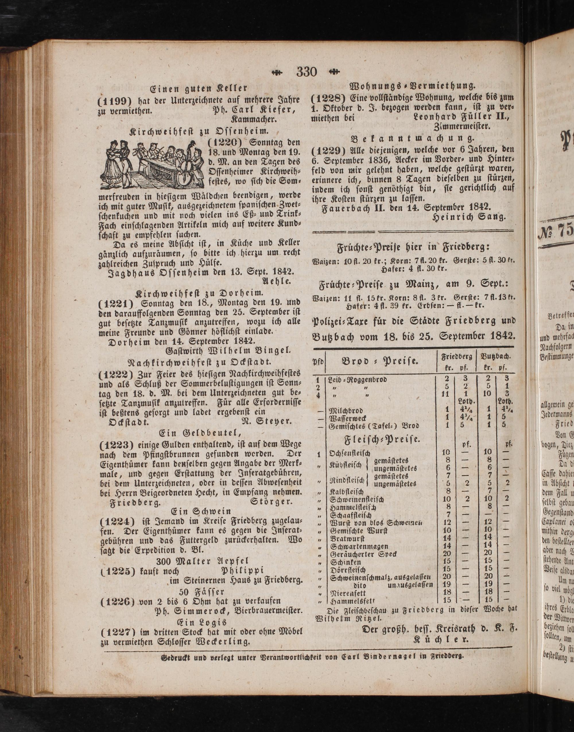(1226) von 2 bis 6 Ohm hat zu verkaufen Ph. Simmerock, Bierbrauermeiſter. Ein Logis (1227) im dritten Stock hat mit oder ohne Möbel zu vermiethen Schloſſer Weckerling.