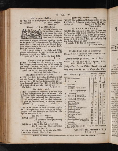 pfo[ Brod ⸗Preiſe. Sriedderg Wußzbach kr. pf. kr. pf. 1 JLeib⸗Roggenbrod 2 3 2 3 2 7. 1 5 2 5 1 44 00 11 1 10 3 Loth. Loth. — Milchbrod 114 ¼ 1 — Waſſerweck 14% 15 — Gemiſchtes(Tafel⸗) Brod 115 115 Fleiſch⸗ ſe. leis, preiſe⸗ 1(Ochſenfleiſch 10— 10— 10g; gemaͤſtetes 81— 84— „Küofieiſch ungemäſtetes 6(— 5— 92 gemäſtetes 7—— „Rindſleiſch ungemäſtetes 52 57 1 „ Kalbfleiſch 84— 7— „ Schweinenfleiſch 10 2 „ Hammellleiſch 8— 9 „ Schaaflleiſch 71—— „ Wurſt von blos Schweinen 124— 1 „Gemiſchte Wurſt 10 104— „ Bratwurſt 14— 14 „Schwartenmagen 14— 144— „ Geräucherter Speck 20— 20— „Schinken 15— 15— „ Doͤrrfleiſch 15— 15— „ Schweinenſchmalz, ausgelaſſen 20— 20— „ dito ungusgelaſſen 19— 194— „ Nierenfett 18— 18— „ Hammelsfett 1 5 Die Fleiſchbeſchau zu Friedberg in dieſer Woche hat