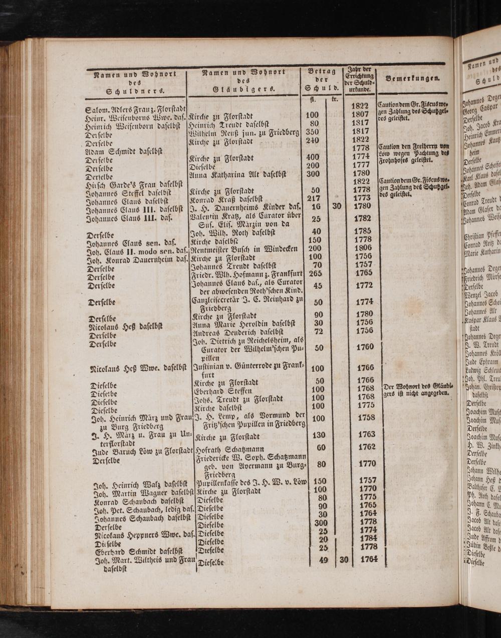 Namen und Wohnort Namen und Wohnort Betrag Jahr der des des der I Bemerkungen. Schuldners. Gläubigers. Schul d. urkunde. 0 kr. Salom. Adlers Frau z. Florſtadt f 1822(Caution dem Gr. Fiscus we⸗ Heinr. Weiſenborns Wwe. daſ. Kirche zu Florſtadt 10⁰ 1807(gen Zahlung des Schußgel⸗ Heinrich Weiſenborn daſelbſt Heinrich Treudt daſelbſt 80 1817 des gelle Derſelbe Wilhelm Reuß jun. zu Friedberg 350 1817 Derſelbe Kirche zu Florſtadt 240 1822 4 Adam Schmidt daſelbſt 1778[Caution den Freiherrn von Derſelbe Kirche zu Florſtadt 400 1774[dow wegen Pachtung des Derſelbe Dieſelbe 200 1777 PFrohnhofcs geleißet. Derſelbe Auna Katharina Alt daſelbſt 300 1780 Hirſch Garde's Frau daſelbſt 1822 Caution dem Gr. Fiscus we⸗ Johannes Steffel daſelbſt Kirche zu Florſtadt 50 1778(gen Zahlung des Schußgel⸗ Johannes Claus daſelbſt Konrad Kraß daſelbſt 27[1773 pes geleistet. i Johannes Claus III. daſelbſt IJ. H. Dauernheims Kinder daſ.] 1630 1780 5 Johannes Claus III. das. Valentin Kratz, als Curator über 25 8 Suſ. Eliſ. Märzin von da 1782 Derſelbe Joh. Wilh. Roth daſelbſt 40 1785 Johannes Claus sen. daſ. Kirche daſelbſt 150 1778 Joh. Claus II. modo sen. daſ.]Rentmeiſter Buſch in Windecken 200 1806 Joh. Konrad Dauernheim daſ.[Kirche zu Florſtadt 100 1756 Derſelbe Johannes Treudt daſelbſt 70 1757 Derſelbe Friedr. Wlh. Hofmann z. Frankfurt] 265 176⁵ Derſelbe Johannes Claus daſ., als Curator 45 7* derte der abweſenden Roth'ſchen Kind. 1772 erſelbe Canzleiſecretär J. C. Reinhard zu 9 Feber hard zu 50 1774 Derſelbe Kirche zu Florſtadt 90 1780 Nicolaus Heß daſelbſt Anna Marie Heroldin daſelbſt 30 1756 Derſelbe Andreas Deuderich daſelbſt 72 1756 Derſelbe Joh. Dietrich zu Reichelsheim, als Curator der Wilhelm'ſchen Pu- 50 1760 pillen Nicolaus Heß Wwe. daſelbſt 1 v. Günterrode zu Frank⸗ 100 1766 urt Dieſelbe Kirche zu Florſtadt 50 1766 Dieſelbe Eberhard Steffen 100 1768 Der Wohnort des Gländl Dieſelbe Johs. Treudt zu Florſtadt 100 1768 gers iß nicht angegeben. Dieſelbe Kirche daſelbſt 100 1775 5 Joh. Heinrich März und FrauſJ. H. Lemp, als Vormund der 100 1758 zu Burg Friedberg Fritz'ſchen Pupillen in Friedberg f H. Mär 4 1 5 3 8 u. Frau zu 15 Kirche zu Florſtadt 130 1763 Jude Baruch Löw zu Florſtadt Hofrath Schatzmann 60 1762 Derſelbe Friedericke W. Soph. Schatzmann geb. von Avermann zu Burg- 80 1770 Friedberg Joh. Heinrich Walz daſelbſt Pupillenkaſſe des J. H. W. v. Low 150 1757 Joh. Martin Wagner daſelbſt Kirche zu Florſtadt 100 1770 Konrad Schaubach daſelbſt Dieſelbe 80 1775 Joh. Pet. Schaubach, ledig daſ. Dieſelbe 90 1765 Johannes Schaubach daſelbſt Dieſelbe 30 1764 Derſelbe Dieſelbe 300 1778 Nicolaus Heppners Wwe. daf. Dieſelbe 25 1774 Die ſelbe Dieſelbe 20 1784 3„ daſelbſt Dieſelbe 2 1778 Joh. Mart. Wiltheis und Frau Dieſelbe 5 esch 0 8 Dicſebe 4 30 1764