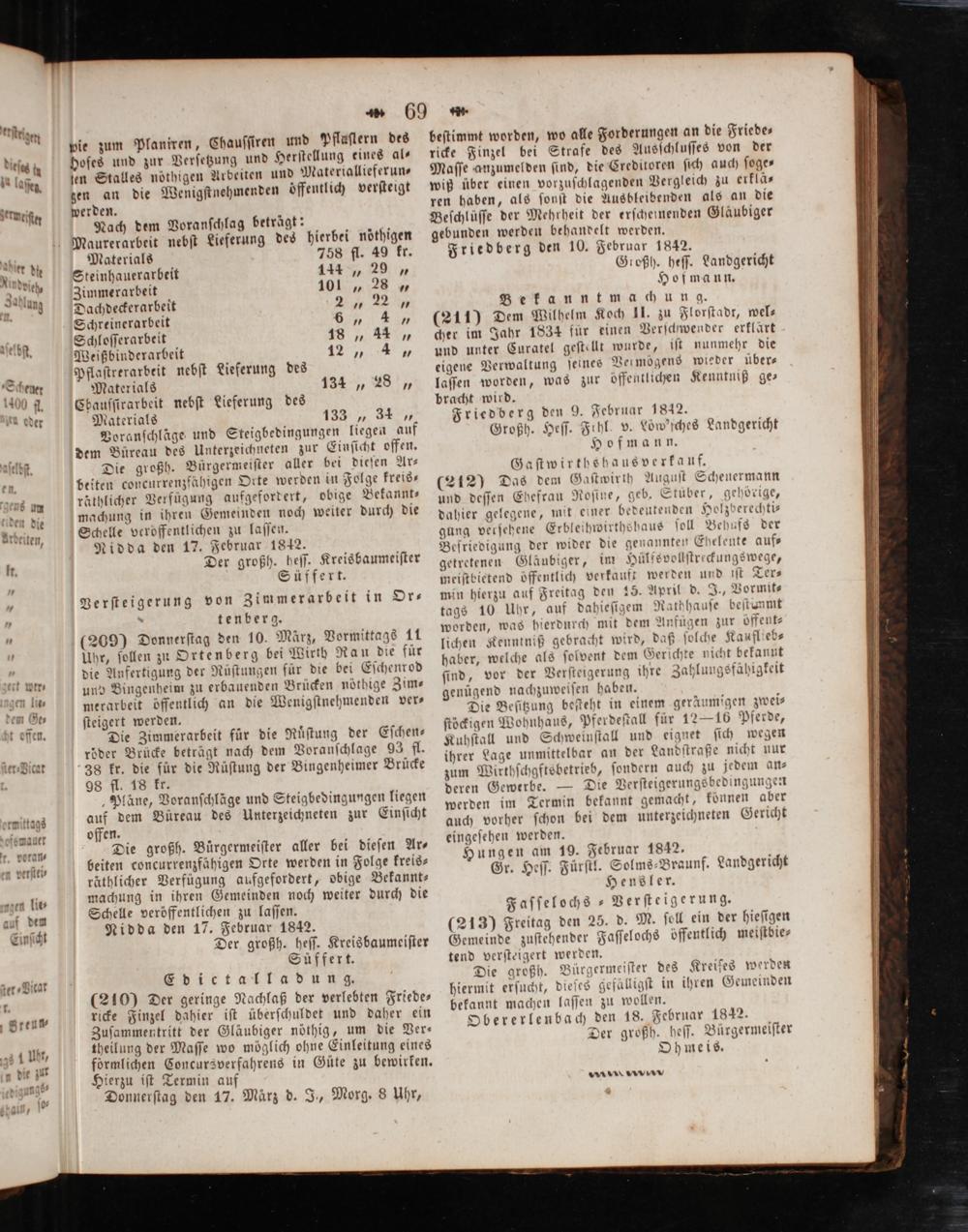 (209) Donnerſtag den 10. März, Vormittags 11 Uhr, ſollen zu Ortenberg bei Wirth Rau die für die Anfertigung der Ruͤſtungen für die bei Eſchenrod und Bingenheim zu erbauenden Brücken noͤthige Zim⸗ merarbeit öffentlich an die Wenigſtnehmenden ver— ſteigert werden.