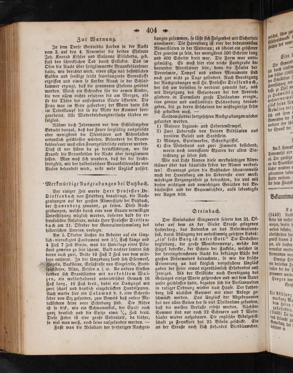 Der Steinbacher Singverein feierte den 31. Ok⸗ tober auf dem an der Gieſer Straße gelegenen Lutherberg, das Andenken an das Reformations— feſt, durch Abſingung des mehrſtimmig geſetzten Liedes: „ein' feſte Burg iſt unſer Gott.“ Die Orcheſter⸗ begleitung, die große Menſchenmenge, welche den Huͤgel bedeckte, der Schein der Fackeln, welcher in der hereingebrochenen Nacht die bekränzte Büſte des großen Reformators beleuchtete, ſo wie die friſche Erinnerung an das kürzlich vorgefallene Unglück gaben der Feier etwas eigenthümlich Erhebendes und Inniges. Als der Geiſtliche nach Beendigung des Geſanges einige Worte geſprochen und mit dem Vater unſer geſchloſſen hatte, begaben ſich die Verſammelten in ruhiger Ordnung wieder nach Hauſe. Der Luther— berg ſoll nächſten Sommer mit einer Anlage ge⸗ ſchmückt werden. Das Unglück der Abgebrannten hat von allen Seiten her ſo viel Theilnahme gefunden, daß die meiſten Verluſte erſetzt werden. Nächſten Sommer ſind nur noch 22 Scheuern und 7 Wohn—⸗ häuſer wieder aufzubauen. Die engliſche Bibelgeſell⸗ ſchaft zu Frankfurt hat 25 Bibeln geſchickt. Ein an der Straße nach Lich ſtehendes Birnbäumchen,