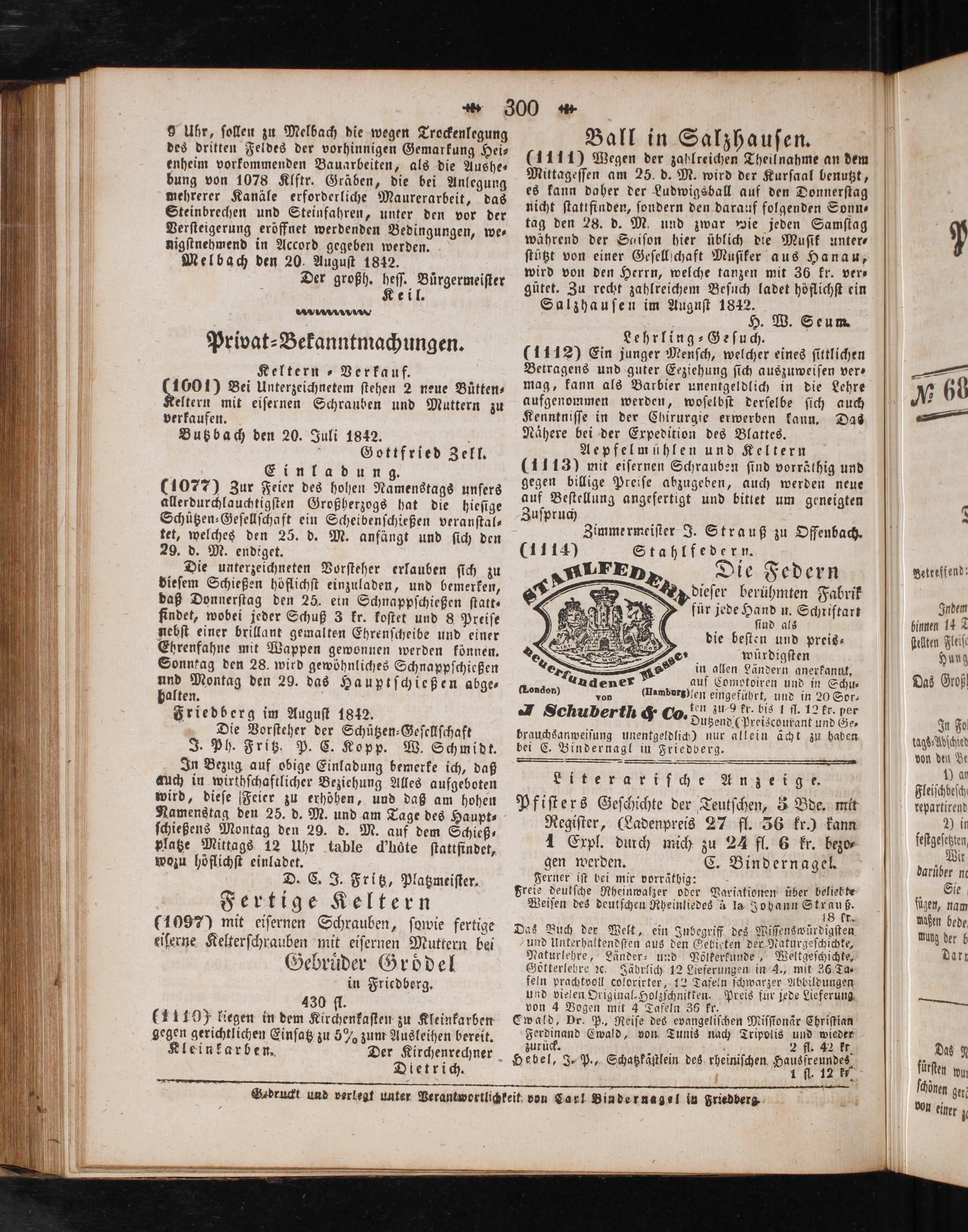 Gedruckt und verlegt unter Perantwortlichkeit von Carl Binder ne gel in Friedberg.