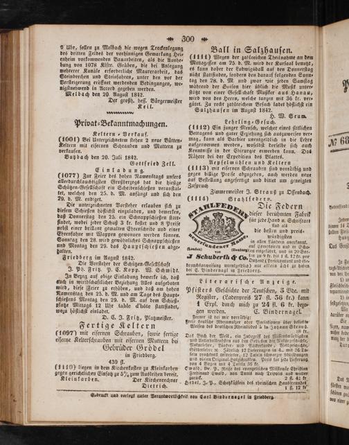 D. C. J. Fritz, Platzmeiſter. Fertige Keltern (1097) mit eiſernen Schrauben, ſowie fertige tiſerne Kelterſchrauben mit eiſernen Muttern bei Gebruͤder Groͤdel in Friedberg. 430 fl. (1110) liegen in dem Kirchenkaſten zu Kleinkarben gegen gerichtlichen Einſatz zu 5% zum Ausleihen bereit. Kleinkarben. Der Kirchenrechner Dietrich.
