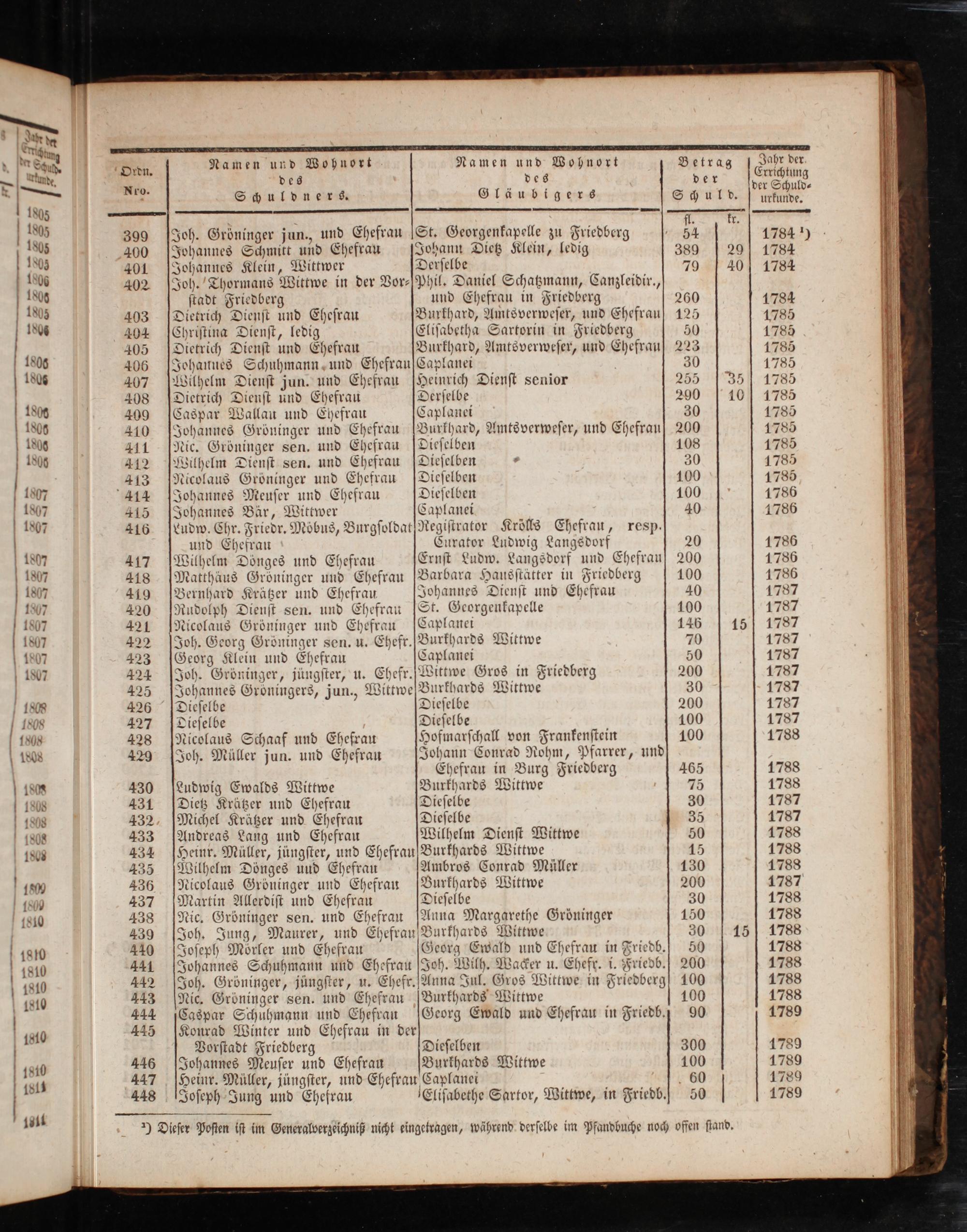 Ordu. Namen. Namen e Wan 3 5 e e r 8 vo. SGulvners. Gläubigers S uv. de. N l. kr. 399 Joh. Gröninger jun., und Ehefrau St. Georgenkapelle zu Friedberg 51 1784) 400 Johannes Schmitt und Ehefrau Johann Dietz Klein, ledig 389 29 1784 401 Johannes Klein, Wittwer Derſelbe 79 401784 402 Joh. Thormans Wittwe in der Vor-[Phil. Daniel Schatzmann, Canzleidir., ſtadt Friedberg und Ehefrau in Friedberg 260 1784 403 Dietrich Dienſt und Eheſrau Burkhard, Amtsverweſer, und Ehefrauf 125 1785 404[Chriſtina Dienſt, ledig Eliſabetha Sartorin in Friedberg 50 1785 405 Dietrich Dienſt und Ehefrau Burkhard, Amtsverweſer, und Ehefrauſ 223 178⁵ 406 Johannes Schuhmann und EhefraufCaplanei 3 1785 407[Wilhelm Dienſt jun. und Ehefrau[Heinrich Dienſt senior 25 351755 408 Dietrich Dienſt und Ehefrau Derſelbe 200[10 1785 409[Caspar Wallau und Ehefrau Caplanei 30 178⁵ 410 Johannes Groͤninger und Ehefrau[Burkhard, Amtsverweſer, und Ehefrauſ 200 1785 411[Nic. Gröninger sen. und Ehefrau Dieſelben 108 1785 412[Wilhelm Dienſt sen. und Ehefrau Dieſelben. 30 1785 413[Nicolaus Gröninger und Ehefrau Dieſelben 100 1785 414 Johannes Meuſer und Ehefrau Dieſelben 100 1786 415 Johannes Bär, Wittwer Caplanei 40 1786 416[Ludw. Chr. Friedr. Möbus, BurgſoldatRegiſtrator Krölls Ehefrau, resp. und Ehefrau Curator Ludwig Langsdorf 20 1786 417[Wilhelm Dönges und Ehefrau Ernſt Ludw. Langsdorf und Ehefrau 200 1786 418[Matthäus Gröninger und Ehefrau Barbara Hausſtätter in Friedberg 100 1786 419[Bernhard Krätzer und Ehefrau Johannes Dienſt und Ehefrau 40 1787 420[Rudolph Dienſt sen. und Ehefrau[St. Georgenkapelle 100 1787 421[Nicolaus Gröninger und Ehefrau[Caplanei 146 15 1787 422 Joh. Georg Gröninger sen. u. Ehefr. Burkhards Wittwe 70 1787 423(Georg Klein und Ehefrau Caplanei 50 1787 424 Joh. Gröninger, jüngſter, u. Ehefr.[Wittwe Gros in Friedberg 200 1787 425 Johannes Groͤningers, jun., WittweBurkhards Wittwe 30 1787 426 Dieſelbe Dieſelbe 200 1787 427 Dieſelbe Dieſelbe 100 1787 428 Nicolaus Schaaf und Ehefrau Hofmarſchall von Frankenſtein 100 1788 429 Joh. Müller jun. und Ehefrau Johann Conrad Rohm, Pfarrer, und Ehefrau in Burg Friedberg 465 1788 430 Ludwig Ewalds Wittwe Burkhards Wittwe 75 1788 431 Dietz Krätzer und Ehefrau Dieſelbe 30 1787 432, Michel Krätzer und Ehefrau Dieſelbe 35 1787 433 Andreas Lang und Ehefrau Wilhelm Dienſt Wittwe 50 1788 434[Heinr. Müller, jüngſter, und Ehefrau Burkhards Wittwe 15 1788 435[Wilhelm Dönges und Ehefrau Ambros Conrad Müller 130 1788 436 Nicolaus Gröninger und Ehefrau Burkhards Wittwe 200 1787 437 Martin Allerdiſt und Ehefrau Dieſelbe 30 1788 438[Nic. Gröninger sen. und Ehefrau Anna Margarethe Gröninger 150 1788 439[Joh. Jung, Maurer, und Ehefrau Burkhards Wittwe 30 15 1788 440 Joſeph Moͤrler und Ehefrau Georg Ewald und Ehefrau in Friedb.“ 50 1788 441 Johannes Schuhmann und Ehefrau Joh. Wilh. Wacker u. Ehefr. i. Friedb.“ 200 1788 442 Joh. Gröninger, jüngſter, u. Ehefr. Anna Jul. Gros Wittwe in Friedberg 100 1788 443 Nic. Gröninger sen. und Ehefrau Burkhards Wittwe 100 1788 444[Caspar Schuhmann und Ehefrau[Georg Ewald und Ehefrau in Friedb.] 90 1789 445[Konrad Winter und Ehefrau in der Vorſtadt Friedberg Dieſelben 300 1789 446 Johannes Meuſer und Ehefrau Burkhards Wittwe 100 1789 447 Heinr. Müller, jüngſter, und Ehefrau Caplanei 60 1789 448 Joſeph Jung und Ehefrau Eliſabethe Sartor, Wittwe, in Friedb.“ 50 1789