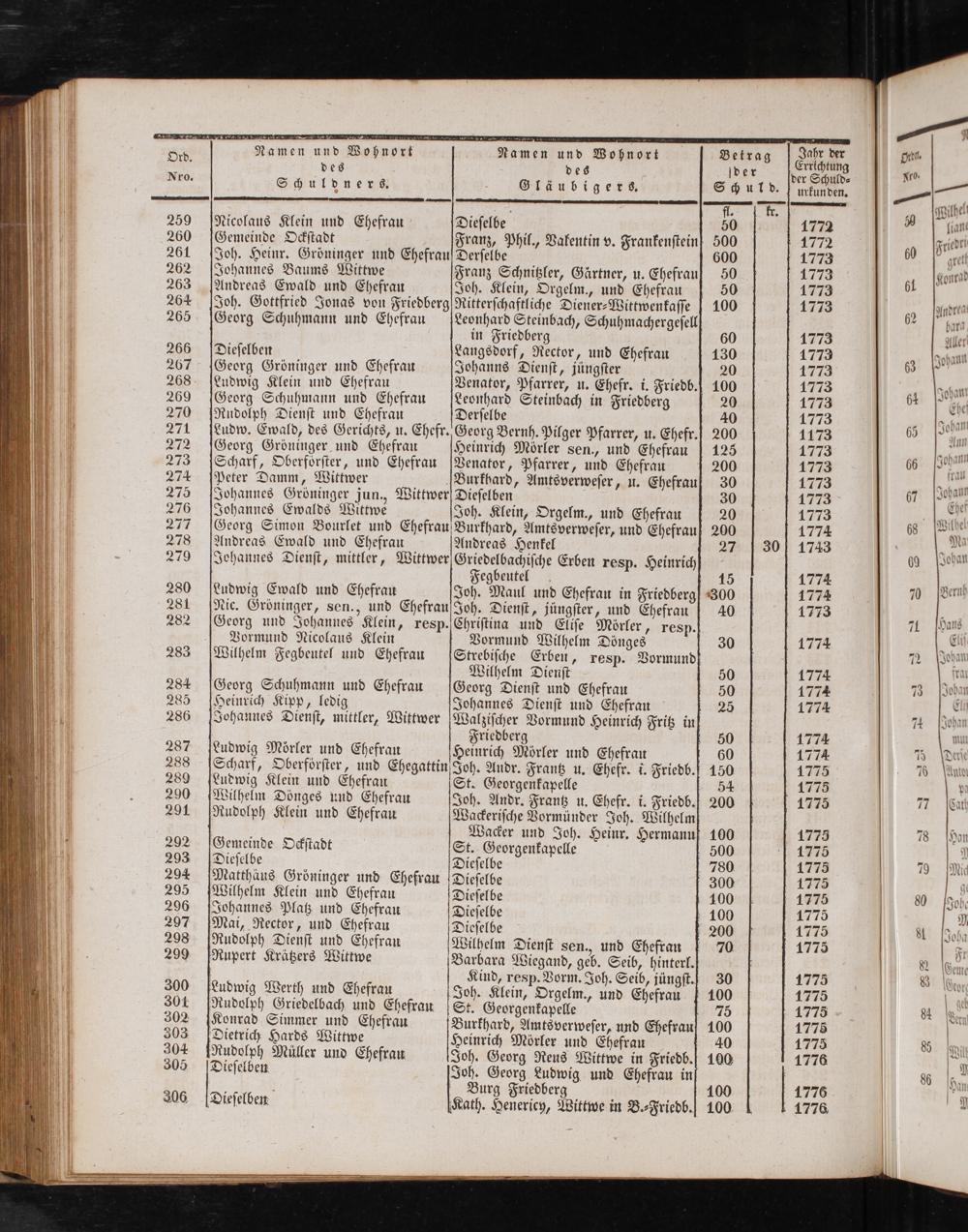 Ord. 5 Namen und Wohnort Betrag Errichtung f es des[der der Schuld⸗ Nro Schuldners. Gläubigers. Schul d. urkunden. 5 fl. kr. 259 Nicolaus Klein und Ehefrau Dieſelbe 50 1772 260[Gemeinde Ockſtadt Franz, Phil., Valentin v. Frankenſteinſ 500 1772 261 Joh. Heinr. Gröninger und Ehefrau Derſelbe 600 1773 262 Johannes Baums Wittwe Franz Schnitzler, Gärtner, u. Ehefrauf 50 1773 263[Andreas Ewald und Ehefrau Joh. Klein, Orgelm., und Ehefrau 50 1773 264 Joh. Gottfried Jonas von Friedberg Ritterſchaftliche Diener-Wittwenkaſſe[100 1773 265[Georg Schuhmann und Ehefrau Leonhard Steinbach, Schuhmachergeſell in Friedberg 60 1773 266 Dieſelben Langsdorf, Rector, und Ehefrau 130 1773 207[Georg Gröninger und Ehefrau Johanns Dienſt, jüngſter 20 1773 268 Ludwig Klein und Ehefrau Venator, Pfarrer, u. Ehefr. i. Friedb.] 100 1773 259(Georg Schuhmann und Ehefrau Leonhard Steinbach in Friedberg 20 1773 270 Rudolph Dienſt und Ehefrau Derſelbe 40 1773 271 ſLudw. Ewald, des Gerichts, u. Ehefr. Georg Bernh. Pilger Pfarrer, u. Ehefr.] 200 1173 272[Georg Gröninger und Ehefrau Heinrich Mörler sen., und Ehefrau[125 1773 273 Scharf, Oberfoͤrſter, und Ehefrau Venator, Pfarrer, und Ehefrau 200 1773 2744 peter Damm, Wittwer Burkhard, Amtsverweſer, u. Ehefrau 30 1773 275 Faohannes Gröninger jun., Wittwer Dieſelben 30 1773 276 Johannes Ewalds Wittwe Joh. Klein, Orgelm., und Ehefrau 20 172 277 Georg Simon Bourlet und Ehefrau Burkhard, Amtsverweſer, und Ehefrau 200 1774 278 Andreas Ewald und Ehefrau Andreas Henkel 27 301743 279 Johannes Dienſt, mittler, Wittwer Griedelbachiſche Erben resp. Heinrich Fegbeutel 15 1774 280 Ludwig Ewald und Ehefrau Joh. Maul und Ehefrau in Friedberg. 300 1774 281 Nic. Gröninger, sen., und Ehefrau Joh. Dienſt, jüngſter, und Ehefrau 40 1773 282(Georg und Johannes Klein, resp. Chriſtina und Eliſe Mörler, resp. Vormund Nicolaus Klein Vormund Wilhelm Dönges 30 1774 283 Wilhelm Fegbeutel und Ehefrau Strebiſche Erben, resp. Vormund Wilhelm Dienſt 50 1774 284[Georg Schuhmann und Ehefrau Georg Dienſt und Ehefrau 50 1774 285(Heinrich Kipp, ledig Johannes Dienſt und Ehefrau 25 1774 286 Johannes Dienſt, mittler, Wittwer Walziſcher Vormund Heinrich Fritz in Friedberg i 50 177 287 Ludwig Mörler und Ehefrau Heinrich Mörler und Ehefrau 60 1774 288 Scharf, Oberförſter, und Ehegattin Joh. Andr. Frantz u. Ehefr. i. Friedb.] 150 1775 289 Ludwig Klein und Ehefrau St. Georgenkapelle 54 1775 290[Wilhelm Dönges und Ehefrau Joh. Andr. Frantz u. Ehefr. i. Friedb.] 200 1775⁵ 291[Rudolph Klein und Ehefrau Wackeriſche Vormünder Joh. Wilhelm Wacker und Joh. Heinr. Hermanuf 100 1775 292(Gemeinde Ockſtadt St. Georgenkapelle 500 1775 293 Dieſelbe Dieſelbe 780 1775 294 Matthäus Gröninger und Ehefrau Dieſelbe 300 1775 295[Wilhelm Klein und Ehefrau Dieſelbe 100 177⁵ 296 Johannes Platz und Ehefrau Dieſelbe 100 1775 297 Mai, Rector, und Ehefrau Dieſelbe 200 1775⁵ 298[Rudolph Dienſt und Ehefrau Wilhelm Dienſt sen., und Ehefrau 70 1775 299 Rupert Krätzers Wittwe Barbara Wiegand, geb. Seib, hinterl. 5 Kind, resp. Vorm. Joh. Seib, jüngſt.] 30 1775 300 Ludwig Werth und Ehefrau Joh. Klein, Orgelm., und Ehefrau 100 1775 301 Rudolph Griedelbach und Ehefrau St. Georgenkapelle 75 1775 302[Konrad Simmer und Ehefrau Burkhard, Amtsverweſer, und Ehefrau 100 1775 303 Dietrich Hards Wittwe Heinrich Mörler und Ehefrau 40 1775 304[Rudolph Müller und Ehefrau Joh. Georg Reus Wittwe in Friedb.] 100 1776 305 Dieſelben Joh. Georg Ludwig und Ehefrau in 95 5 Burg Friedberg 100 1776 306 Dieſelben Kath. Henericy, Wittwe in B.⸗Friedb. 100 1776