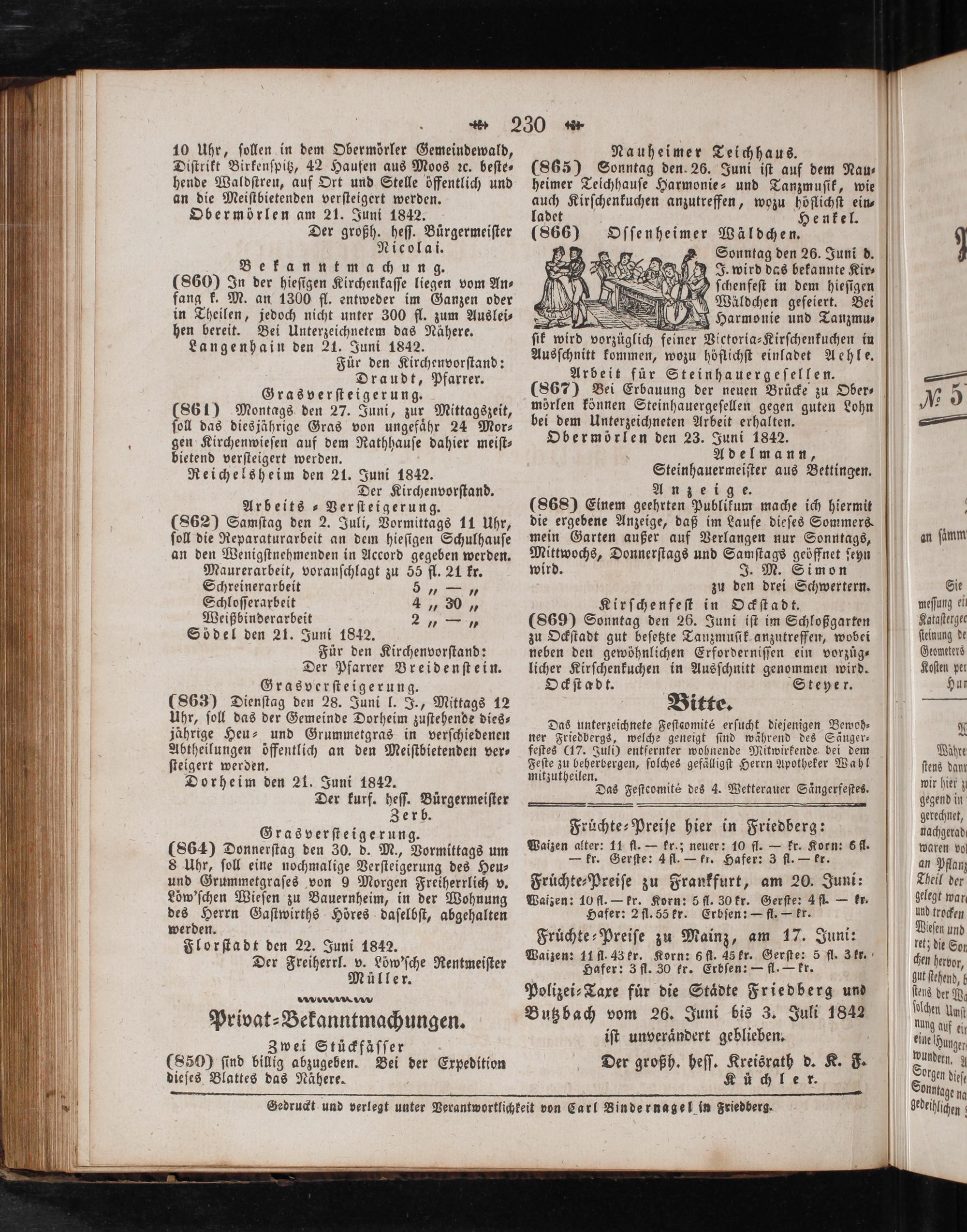 Obermörlen den 23. Juni 1842. Adelmann, Steinhauermeiſter aus Bettingen. „Anz e ige. (868) Einem geehrten Publikum mache ich hiermit die ergebene Anzeige, daß im Laufe dieſes Sommers. mein Garten außer auf Verlangen nur Sonntags, Mittwochs, Donnerſtags und Samſtags geöffnet ſeyn wird. J. M. Simon zu den drei Schwertern. Kirſchenfeſt in Ockſtadt. (869) Sonntag den 26. Juni iſt im Schloßgarten zu Ockſtadt gut beſetzte Tanzmuſik anzutreffen, wobei neben den gewöhnlichen Erforderniſſen ein vorzüg— licher Kirſchenkuchen in Ausſchnitt genommen wird.