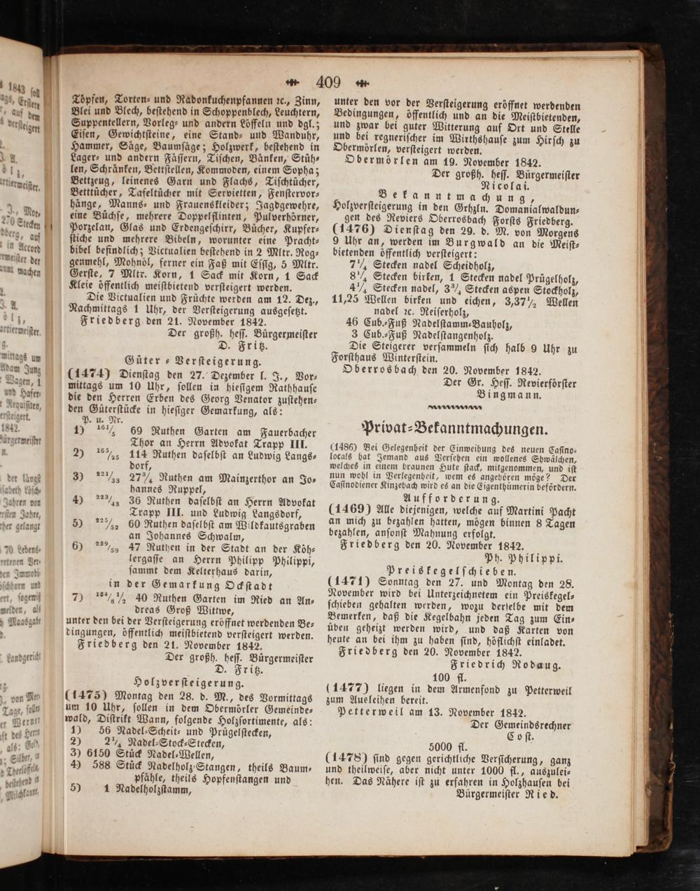 (1486) Bei Gelegenheit der Einweihung des neuen Caſino—⸗ locals hat Jemand aus Verſehen ein wollenes Shwälchen, welches in einem braunen Hute ſtack, mitgenommen, und iſt nun wohl in Verlegenheit, wem es angehören möge? Der Caſinodiener Kinzebach wird es an die Eigenthuͤmerin befördern. Aufforderung. (1469) Alle diejenigen, welche auf Martini Pacht an mich zu bezahlen hatten, mögen binnen 8 Tagen bezahlen, anſonſt Mahnung erfolgt. Friedberg den 20. November 1842. Ph. Philippi. Preiskegelſchieben. (1471) Sonntag den 27. und Montag den 28. November wird bei Unterzeichnetem ein Preiskegel⸗ ſchieben gehalten werden, wozu derſelbe mit dem Bemerken, daß die Kegelbahn jeden Tag zum Ein⸗ üben geheizt werden wird, und daß Karten von heute an bei ihm zu haben ſind, höflichſt einladet. Friedberg den 20. November 1842. Friedrich Rodaug. 100 fl. (1477) liegen in dem Armenfond zu Petterweil zum Aueleihen bereit. Petterweil am 13. November 1842. Der Gemeindsrechner