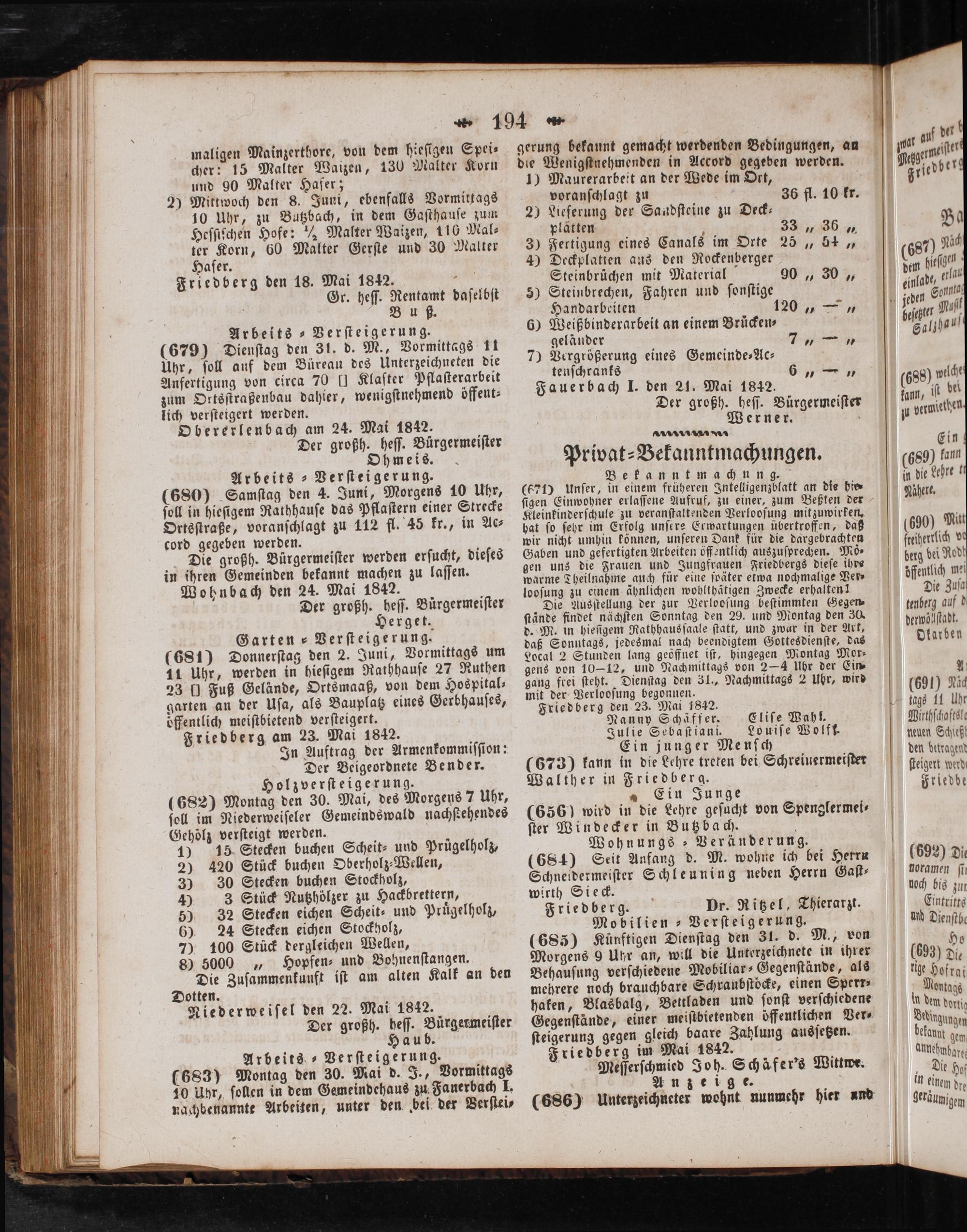 Die großh. Bürgermeiſter werden erſucht, dieſes in ihren Gemeinden bekannt machen zu laſſen. Wohnbach den 24. Mai 1842. Der großh. heſſ. Bürgermeiſter erget. Garten Verſteigerung.