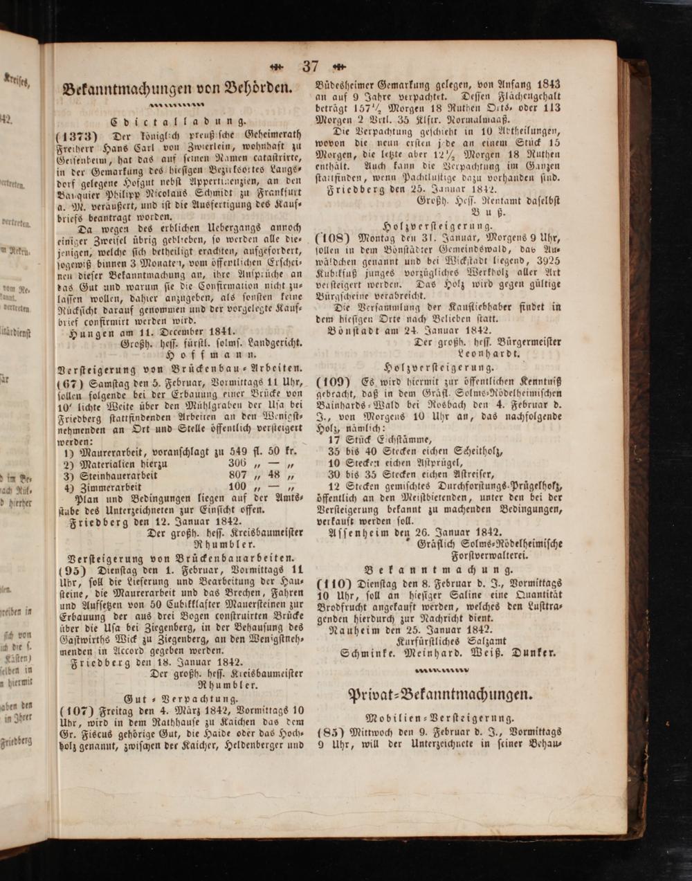 Hungen am 11. December 1841. Großh. heſſ. fürſtl. ſolmſ. Landgericht. Hoffmann. Verſteigerung von Brückenbau Arbeiten. (67) Samſtag den 5. Februar, Vormittags 11 Uhr, ſollen folgende bei der Erbauung einer Brücke von 10“ lichte Weite über den Mühlgraben der Uſa bei Friedberg ſtattfindenden Arbeiten an den Wenigſt⸗ nehmenden an Ort und Stelle öffentlich verſteigert werden: 1) Maurerarbeit, voranſchlagt zu 549 fl. 50 kr.