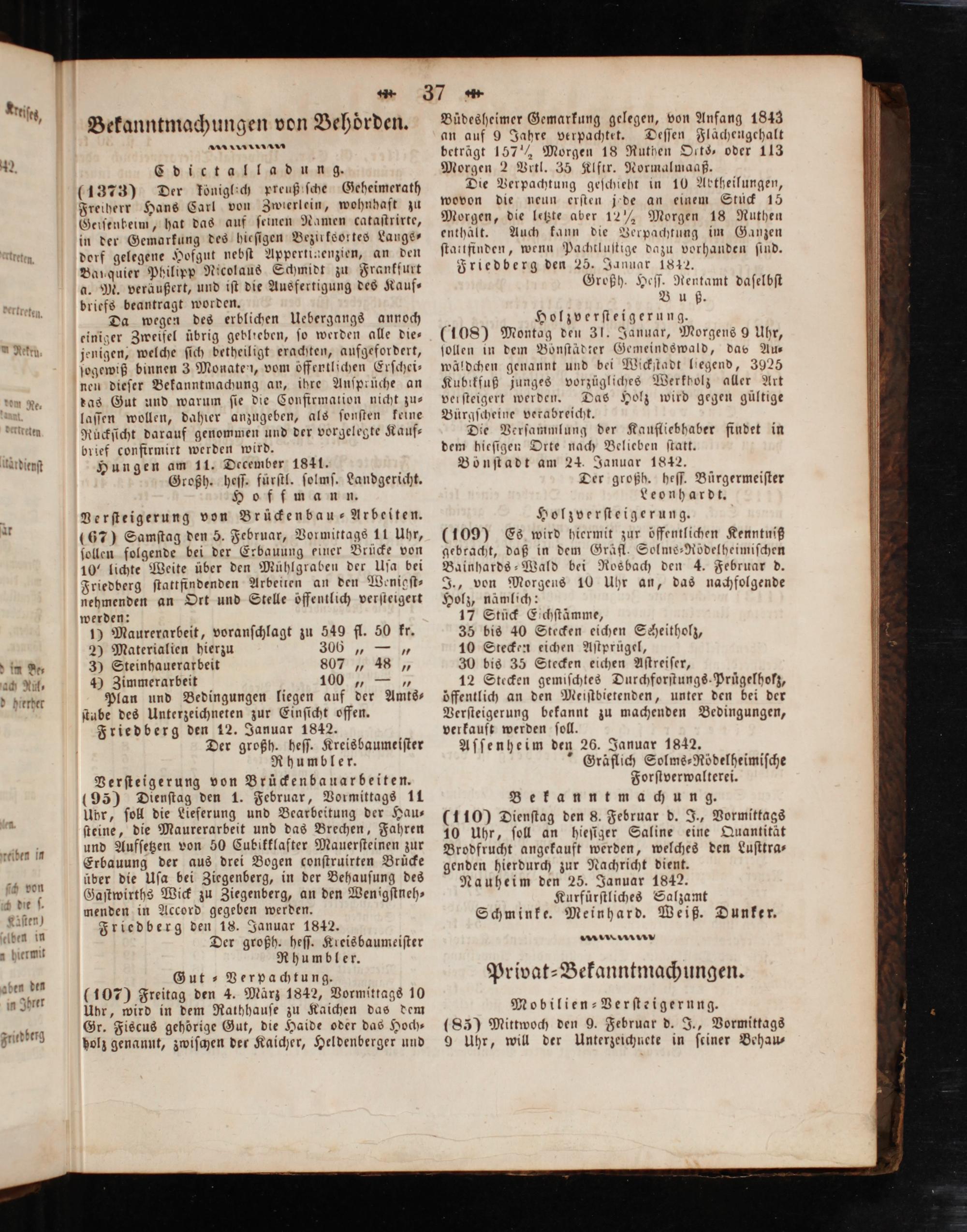 1 7 Plan und Bedingungen liegen auf der Amts⸗ ſtube des Unterzeichneten zur Einſicht offen. Friedberg den 12. Januar 1842. Der großh. heſſ. Kreisbaumeiſter Rhumbler. Verſteigerung von Brückenbauarbeiten. (95) Dienſtag den 1. Februar, Vormittags 11 Ubr, ſoll die Lieferung und Bearbeitung der Hau— ſteine, die Maurerarbeit und das Brechen, Fahren und Aufſetzen von 50 Cubikklafter Mauerſteinen zur Erbauung der aus drei Bogen conſtruirten Brücke über die Uſa bei Ziegenberg, in der Behauſung des Gaſtwirths Wick zu Ziegenberg, an den Wenigſtneh— menden in Accord gegeben werden. Friedberg den 18. Januar 1842. Der großh. heſſ. Kreisbaumeiſter Rhumbler. Gut⸗ Verpachtung. (407) Freitag den 4. März 1842, Vormittags 10 Uhr, wird in dem Rathhauſe zu Kaichen das dem Gr. Fiscus gehörige Gut, die Haide oder das Hoch— dolz genannt, zwiſchen der Kaicher, Heldenberger und