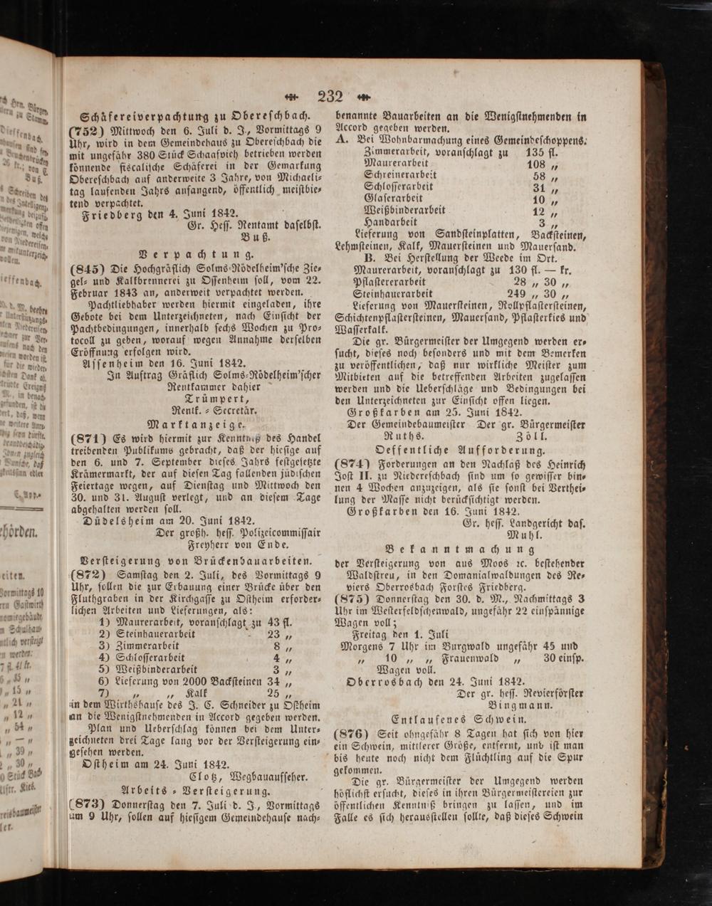 Verpachtung. (845) Die Hochgräflich Solms-Rödelheim'ſche Zie— gel⸗ und Kalkbrennerei zu Oſſenheim ſoll, vom 22. Februar 1843 an, anderweit verpachtet werden. Pachtliebhaber werden hiermit eingeladen, ihre Gebote bei dem Unterzeichneten, nach Einſicht der Pachtbedingungen, innerhalb ſechs Wochen zu Pro— tocoll zu geben, worauf wegen Annahme derſelben Eröffnung erfolgen wird. Aſſenheim den 16. Juni 1842. In Auftrag Gräflich Solms-Rödelheim'ſcher Rentkammer dahier Trümpert, Rentk.⸗Secretär. Marktanzeige. (871) Es wird hiermit zur Kenntuiß des Handel treibenden Publikums gebracht, daß der hieſige auf den 6. und 7. September dieſes Jahrs feſtgeſetzte Krämermarkt, der auf dieſen Tag fallenden jüdiſchen Feiertage wegen, auf Dienſtag und Mittwoch den 30. und 31. Auguſt verlegt, und an dieſem Tage abgehalten werden ſoll. Düdelsheim am 20. Juni 1842. Der großh. heſſ. Polizeicommiſſair Freyherr von Ende.