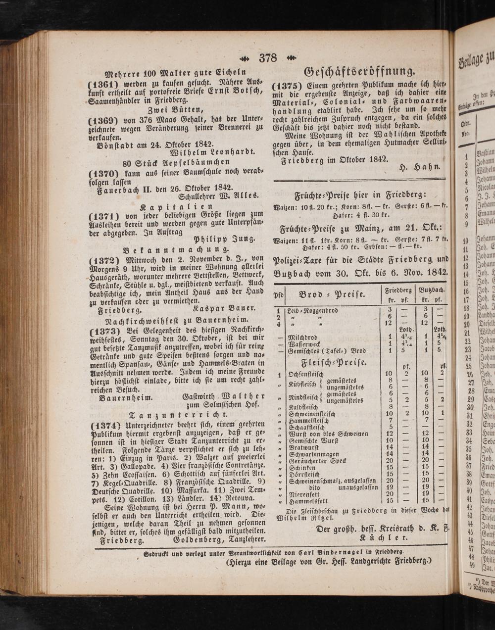 Polizei⸗Taxe fur die Städte Friedberg und Butzbach vom 30. Okt. bis 6. Nov. 1842.