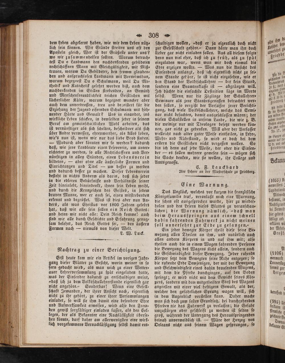 dem Leben abgelernt haben, wie wir dem Leben nuͤtz⸗ lich ſein können. Wir Stände ſtreiten uns oft den Apoſteln gleich, Wer iſt der Größeſte unter uns? wo wir zuſammenhelfen ſollten. Warum betrach⸗ teſt Du o Landmann den nachdenkenden gebildeten rechtſchaffnen Mann mit Gleichgültigkeit, mit Miß⸗ trauen, warum Du Gebildeter, den fromm glauben— den und anſpruchloſen Landmann mit Vornehmthun, warum begegneſt Du o Schulmann, weil Du Me— thodik und Katechetik gelehrt worden biſt, auch dem nachdenkenden im Stillen ſtrebenden, an Gemüth und Menſchenfreundlichkeit reichen Geiſtlichen mit lächerlicher Kälte, warum begegnet mancher aber auch dem unverdroſſen, treu und begeiſtert für die Erziehung der Jugend eifernden Schulmann mit höh— nender Härte und Gewalt? Uns in einander, ins wirkliche Leben ſchicken, in demſelben jeder in ſeinem Beruf am gemeinſchaftlichen Wohl arbeiten, das iſt vernünftiger als ſich ſchelten, beſcheidner als ſich über Andre vermeſſen, ehrenwerther, als Alles loben, wie's nun iſt, wenn wir nur das liebe Brod finden. — Wodurch aber könnten wir ſo werden? dadurch daß, wie jene Landleute einen Leſeverein, um unter⸗ richteter zu werden, ſo alle Rechtſchaffnen und Ver— nünftigen in allen Ständen, einen Lebensverein bildeten,— aber ohne alle äußerliche Formen und Einrichtungen und Titel— um beſſer zu werden und dadurch beſſer zu machen. Dieſer Lebensverein beſteht in nichts Anderm als darin, daß ſich jeder in die edleren Bedurfniſſe und Verhältniſſe ſeiner Zeit hineinlebt, hineindenkt, ihnen ſein Leben weiht, und durch die Kennzeichen des Geiſtes, in jedem braven Manne, wer er auch ſei, einen mitſtrebenden erkennt und begrüßet. Was iſt dies aber nun An— ders, als was Chriſtus vor 1800 Jahren gelehrt hat, daß wir alle ſein ſollen ein Reich Gottes: und beten wir nicht alle: Dein Reich komme! auch ſind wir alle durch Geſchichte und Erfahrung genug— ſam belehrt, das Reich Gottes ſei,— den äußern Formen nach— niemals von dieſer Welt. L. W. Luck.