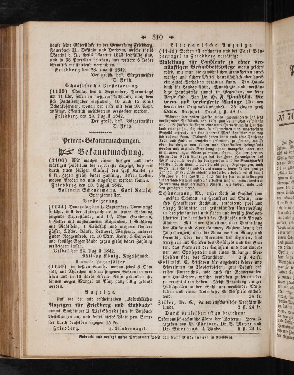 Gedruckt und verlegt unter Verantwortlichkeit von Carl Binder nagel in Friedberg.