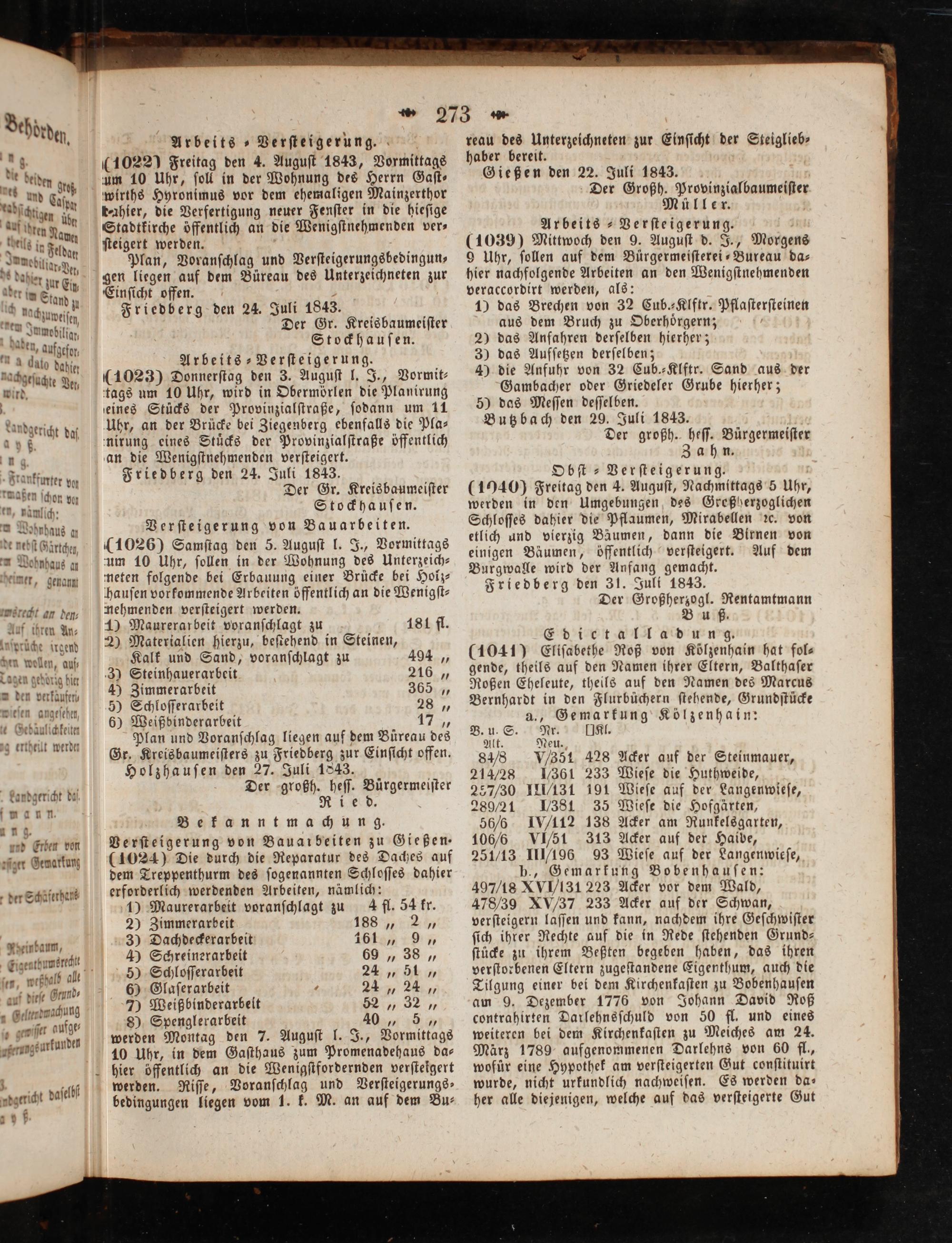 reau des Unterzeichneten zur Einſicht der Steiglieb⸗ haber bereit. Gießen den 22. Juli 1843. Der Großh. Provinzialbaumeiſter Müller. Arbeits-Verſteigerung. (1039) Mittwoch den 9. Auguſt d. J., Morgens 9 Uhr, ſollen auf dem Bürgermeiſterei-Bureau da⸗ hier nachfolgende Arbeiten an den Wenigſtnehmenden veraccordirt werden, als: 1 das Brechen von 32 Cub.-Klftr. Pflaſterſteinen aus dem Bruch zu Oberhoͤrgern; 2) das Anfahren derſelben hierher; 3) das Aufſetzen derſelben; 4) die Anfuhr von 32 Cub.⸗Klftr. Sand aus der Gambacher oder Griedeler Grube hierher; 5) das Meſſen deſſelben. Butzbach den 29. Juli 1843. Der großh. heſſ. Bürgermeiſter Zahn. Obſt-Verſteigerung. (1940) Freitag den 4. Auguſt, Nachmittags 5 Uhr, werden in den Umgebungen des Greßherzoglichen Schloſſes dahier die Pflaumen, Mirabellen ꝛc. von etlich und vierzig Bäumen, dann die Birnen von einigen Bäumen, öffentlich verſteigert. Auf dem Burgwalle wird der Anfang gemacht. Friedberg den 31. Juli 1843. Der Großherzogl. Rentamtmann Bu ß. Edictalla dung. (1041) Eliſabethe Roß von Koͤlzenhain hat fol⸗ gende, theils auf den Namen ihrer Eltern, Balthaſer Roßen Eheleute, theils auf den Namen des Marcus Bernhardt in den Flurbüchern ſtehende, Grundſtücke a., Gemarkung Kölzenhain: