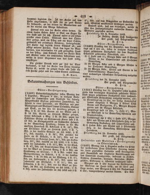 (1458) Erbvertheilungshalber ſollen Montag den 4 Dezember, Morgens 9 Uhr, in hieſigem Rath⸗ hauſe die ſämmtlichen zum Nachlaſſe der Ludwig Wagenknechts Ehefrau gehörenden Immobilien, be⸗ ſtehend in einer Hofraithe, als Mühlbau mit zwei Mahlgängen und Mahlwerk ſammt Oelmühle, Scheuer und Stall, an der Uſa bei Friedberg gelegen, 2 Mrg. 3 V. 32 Rth. Garten an der Mühle und 2 V. 18 Rth. Garten an Heinrich Müller gelegen, ferner Ackerland 1 Mrg. 2 V. 26 Rth. gegen der Ockſtädter Gränze an Geheimerath Knorr und 2 V. 17 Rth. im Kleingalgenfeld an Poſtmeiſter Helmolt in der Gemarkung Friedberg, ſodann in der Ge⸗ markung Fauerbach II. Ackerland 2 V. 16 ¼ Rth. am Dorheimer Pfad an Heinrich Falk, 2 V. ½ Rth. in der dunkeln Gewann an ſich ſelbſt, 2 V. 2¼ Rth. daſelbſt, 1 V. 20 ½ Rth. zwiſchen der Hohle an G. Billaſch, 1 V. 10% Rth. auf der Judenhohle an Rudolph Haas, 31 ½ Rth. am Hocken⸗ berg, 33¼ Rth. daſelbſt an ſich ſelbſt, 1 V. 4 Rth. unter der Judenhohle, 1 V. 25 ½ Rth. in der Elach, 1 V. 4¼ Rth. am Bauernheimer Weg, 2 V. 2 Rth. vor der Mark an Heinrich Sang, 2 V. 6 Rth. am Brückenweg an Philippi, 1 V. 8 Rth. rechts dem Mainzerthorweg an Billaſch, 1 V. in der dunklen Gewann, 1 V. 20 Nth. an der Wuͤſtung, 1 V. 6 Rth. am Holderpuſch, 1 V. 23¾ Rth. unter der Judenhohle am Edelspfad, 1 V. 21% Rth. am Hellwaſen, 1 V. 31¼ Rth. vor der Mark an Phi⸗ lippi, 34 Rth. am Hockenberg an ſich ſelbſt, 3 V. 4 Rth. unter der Judenhohle an ſich ſelbſt und 3 V.