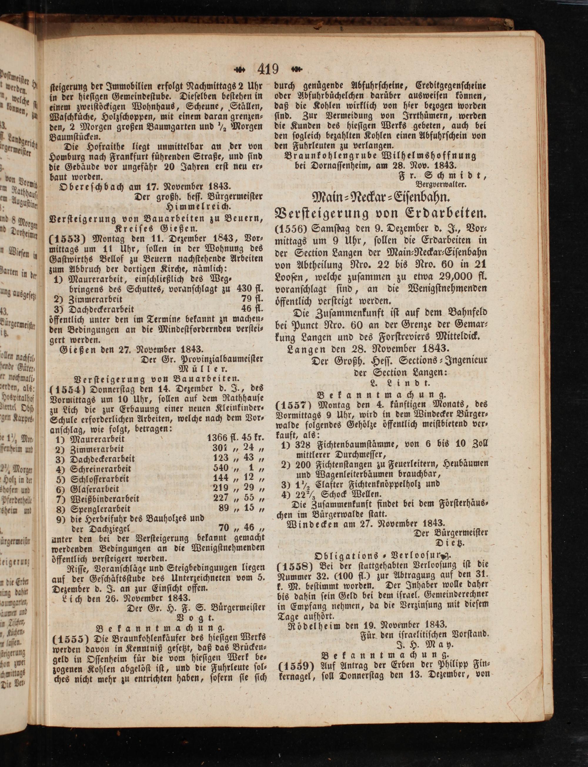 Langen den 28. November 1843. Der Großh. Heſſ. Sections-Ingenieur der Section Langen: ei pd t. Bekanntmachung. (1557) Montag den 4. künftigen Monats, des Vormittags 9 Uhr, wird in dem Windecker Bürger⸗ walde folgendes Gehölze öffentlich meiſtbietend ver⸗ kauft, als: 10 328 Fichtenbaumſtämme, von 6 bis 10 Zoll mittlerer Durchmeſſer, 29 200 Fichtenſtangen zu Feuerleitern, Heubäumen und Wagenleiterbäumen brauchbar, 3) 1½ Clafter Fichtenknöppelholz und 4) 22¼ Schock Wellen. Die Zuſammenkunft findet bei dem Förſterhäus⸗ chen im Bürgerwalde ſtatt. Windecken am 27. November 1843. Der Buͤrgermeiſter Dietz. Obligations Verlooſurg. (1558) Bei der ſtaͤttgehabten Verlooſung iſt die Nummer 32.(100 fl.) zur Abtragung auf den 31. k. M. beſtimmt worden. Der Inhaber wolle daher bis dahin ſein Geld bei dem israel. Gemeinderechner in Empfang nehmen, da die Verzinſung mit dieſem Tage aufhoͤrt. Rödelheim den 19. November 1843. Für den iſraelitiſchen Vorſtand. J. H. May. Bekanntmachung. (1559) Auf Antrag der Erben der Philipp Fin⸗ kernagel, ſoll Donnerſtag den 13. Dezember, von
