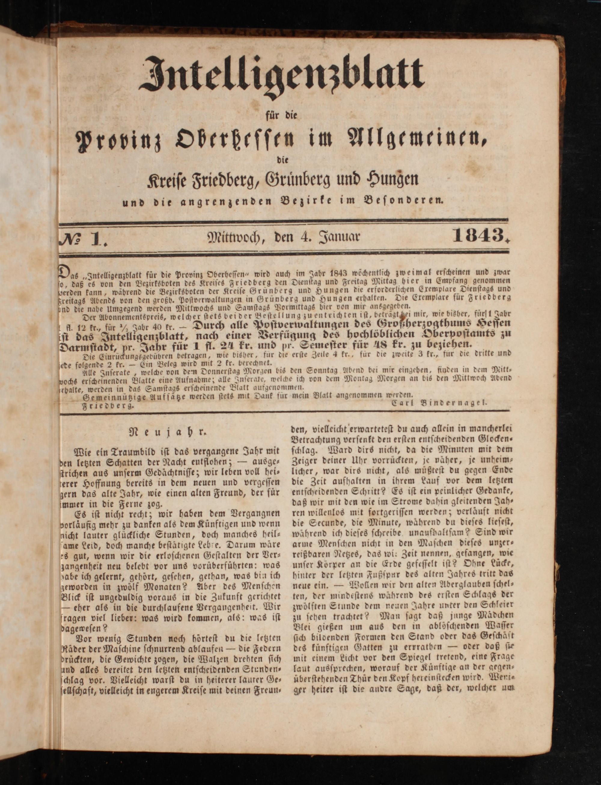 D.„Intelligenzblatt für die Provinz Oberheſſen“ wird auch im Jahr 1843 wöchentlich zweimal erſcheinen und zwar ſo, daß es von den Bezirksboten des Kreiſes Friedberg den Dienſtag und Freitag Mittag hier in Empfang genommen bperden kann, während die Bezirksboten der Kreiſe Grünberg und Hungen die erforderlichen Cxemplare Dienſtags und