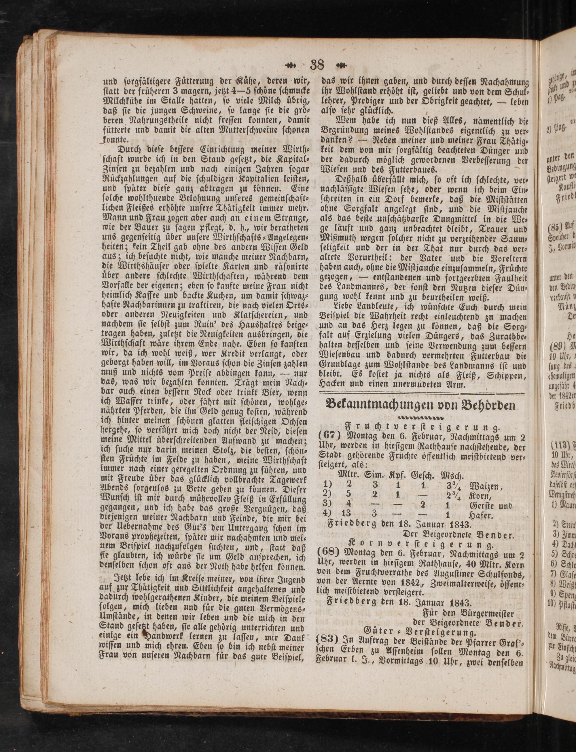 Friedberg den 18. Januar 1843. Der Beigeordnete Bender. Kornverſtei gerung. (68) Montag den 6. Februar, Nachmittags um 2 Uhr, werden in hieſigem Rathhauſe, 40 Mltr. Korn von dem Fruchtvorrathe des Auguſtiner Schulfonds, von der Aernte von 1842, Zweimalterweiſe, öffent⸗ lich meiſtbietend verſteigert. Friedberg den 18. Januar 1843. Für den Bürgermeiſter der Beigeordnete Bender. Güter ⸗Verſteigerung. (83) In Auftrag der Beiſtände der Pfarrer Graf'⸗ ſchen Erben zu Aſſenheim ſollen Montag den 6. Februar l. J., Vormittags 10 Uhr, zwei denſelben