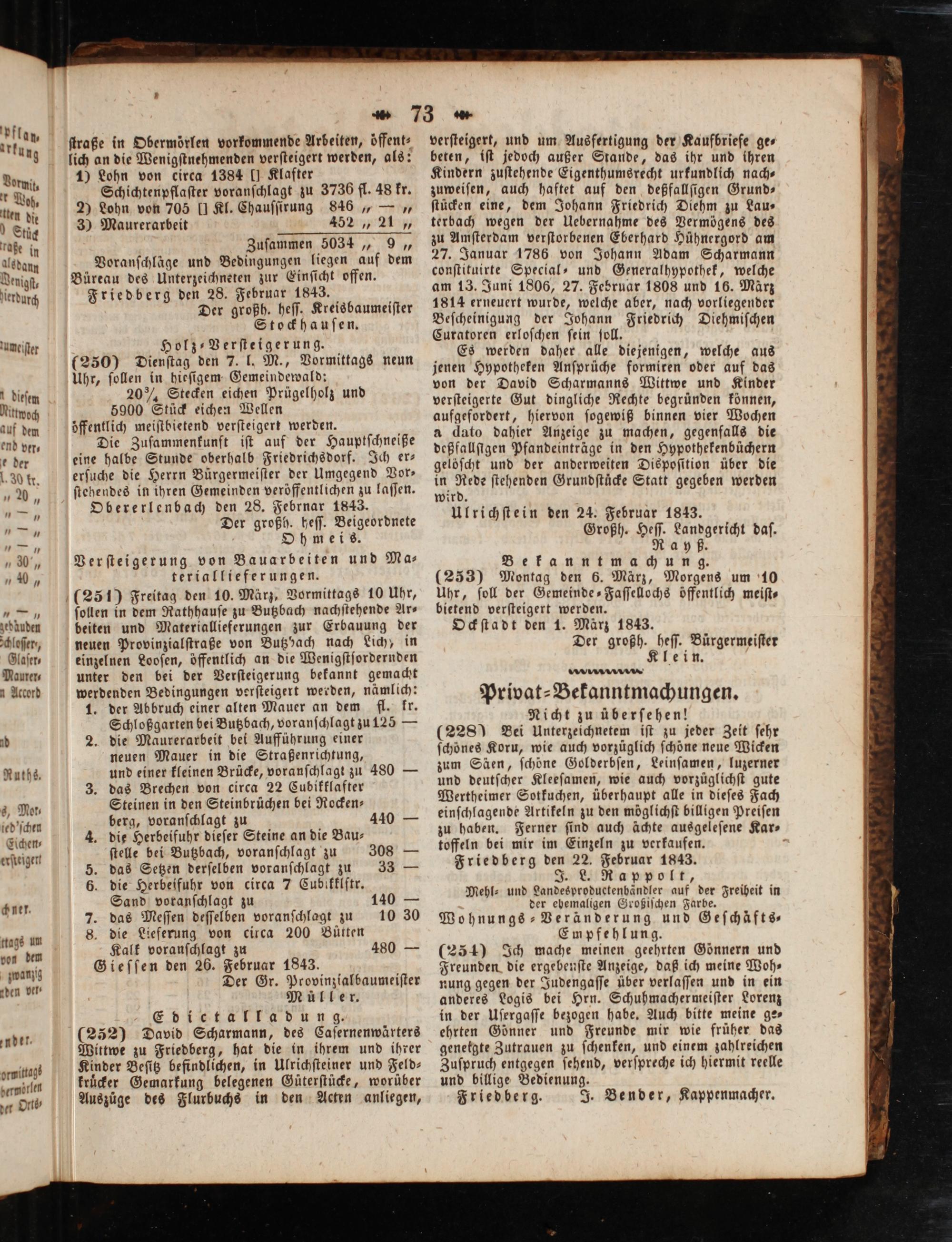 Friedberg den 28. Februar 1843. Der großh. heſſ. Kreisbaumeiſter Stockhauſen. Holz-Verſteigerung. (250) Dienſtag den 7. l. M., Vormittags neun Uhr, ſollen in hieſigem Gemeindewald: 20 ¾ Stecken eichen Prügelholz und 5900 Stück eichen Wellen öffentlich meiſtbietend verſteigert werden.
