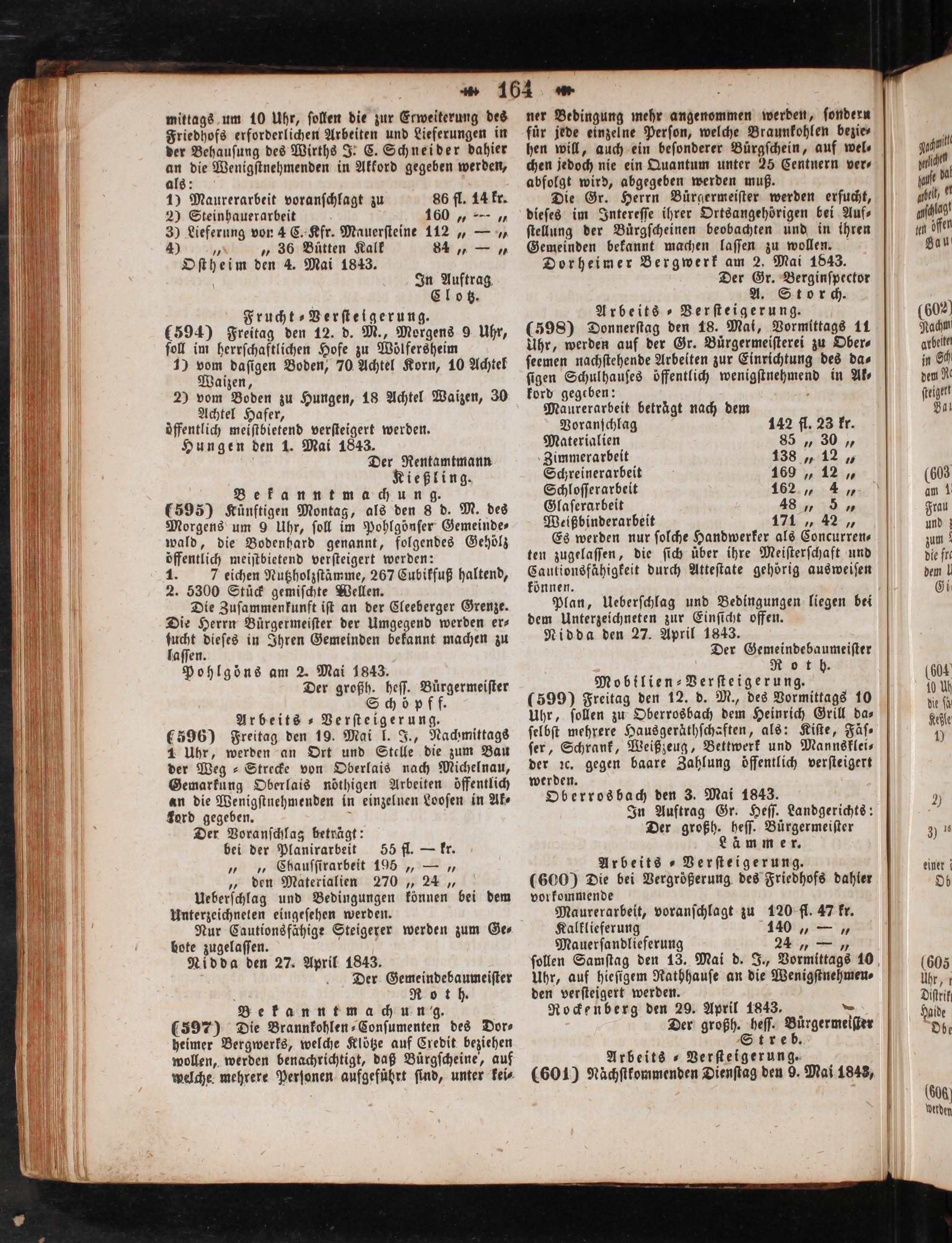 Nidda den 27. April 1843. Der Gemeindebaumeiſter Roth. Mobilien⸗Verſteigerung. (599) Freitag den 12. d. M., des Vormittags 10 Uhr, ſollen zu Oberrosbach dem Heinrich Grill da⸗ ſelbſt mehrere Hausgeräthſchaften, als: Kiſte, Fäſ⸗ ſer, Schrank, Weißzeug, Bettwerk und Mannsklei⸗ der ꝛc. gegen baare Zahlung öffentlich verſteigert werden. Oberros bach den 3. Mai 1843. In Auftrag Gr. Heſſ. Landgerichts: Der großh. heſſ. Buͤrgermeiſter Lämmer. Arbeits ⸗Verſteigerung. (600) Die bei Vergrößerung des Friedhofs dahler vorkommende