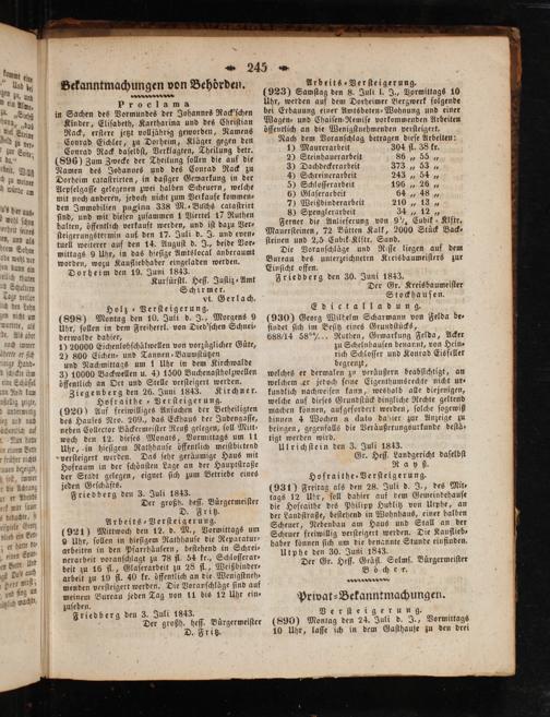 Bekanntmachungen von Behoͤrden. NU Pro cla m a in Sachen des Vormundes der Johannes Rack'ſchen Kinder, Eliſabeth, Kartharina und des Chriſtian Rack, erſtere jetzt volljährig geworden, Namens Conrad Eichler, zu Dorheim, Kläger gegen den Conrad Rack daſelbſt, Verklagten, Theilung betr. (896) Zum Zwecke der Theilung ſollen die auf die Namen des Johannes und des Conrad Rack zu Dorheim cataſtrirten, in daſiger Gemarkung in der Aepfelgaſſe gelegenen zwei halben Scheuern, welche mit noch anderen, jedoch nicht zum Verkaufe kommen⸗ den Immobilien pagina 338 M.«⸗Buchs cataſtrirt ſind, und mit dieſen zuſammen 1 Viertel 17 Ruthen halten, öffentlich verkauft werden, und iſt dazu Ver—⸗ ſteigerungstermin auf den 17. Juli d. J. und even⸗ tuell weiterer auf den 14. Auguſt d. J., beide Vor⸗ mittags 9 Uhr, in das hieſige Amtslocal anberaumt worden, wozu Kaufliebhaber eingeladen werden. Dorheim den 19. Juni 1843. Kurfürſtl. Heſſ. Juſtiz⸗Amt Schirmer. vt. Gerlach. Holz ⸗Verſteigerung. (898) Montag den 10. Juli d. J., Morgens 9 Uhr, ſollen in dem Freiherrl. von Died'ſchen Schnei⸗ derwalde dahier, 10 20000 Eichenlohſchälwellen von vorzüglicher Güte, 2) 800 Eichen⸗ und Tannen⸗Baumſtützen und Nachmittags um 1 Uhr in dem Kirchwalde 3) 10000 Backwellen u. 4) 1500 Buchenaſtholzwellen öffentlich an Ort und Stelle verſteigert werden. Ziegenberg den 26. Juni 1843. Kirchner. Hofraithe-Verſteigerung. (920) Auf freiwilliges Anſuchen der Betheiligten des Hauſes Nro. 209., das Eckhaus der Judengaſſe, neben Collector Bäckermeiſter Reuß gelegen, ſoll Mitt— woch den 12. dieſes Monats, Vormittags um 11 Uhr, in hieſigem Rathhauſe öffentlich meiſtbietend verſteigert werden. Das ſehr geräumige Haus mit Hofraum in der ſchönſten Lage an der Hauptſtraße der Stadt gelegen, eignet ſich zum Betriebe eines jeden Geſchäfts. Friedberg den 3. Juli 1843. Der großh. heſſ. Bürgermeiſter D. Fritz. Arbeits-Verſteigerung. (921) Mittwoch den 12. d. M., Vormittags um 9 Uhr, ſollen in hieſigem Rathhauſe die Reparatur- arbeiten in den Pfarrhäuſern, beſtehend in Schrei— nerarbeit voranſchlagt zu 78 fl. 54 kr., Schloſſerar⸗ beit zu 16 fl., Glaſerarbeit zu 28 fl., Weißbinder⸗ arbeit zu 19 fl. 40 kr. öffentlich an die Wenigſtneh⸗ menden verſteigert werden. Die Voranſchläge ſind auf meinem Bureau jeden Tag von 11 bis 12 Uhr ein⸗ zuſehen. Friedberg den 3. Juli 1843. Der großh. heſſ. Buͤrgermeiſter D. Fritz.