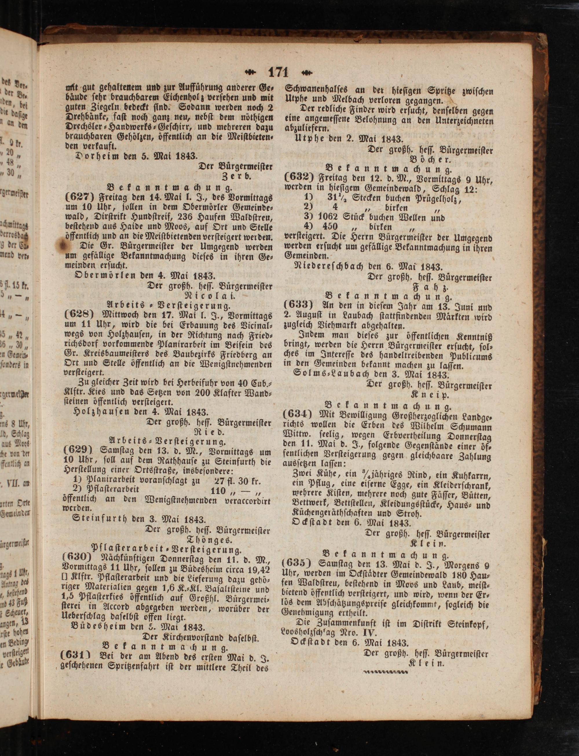 Utphe den 2. Mai 1843. Der großh. heſſ. Buͤrgermeiſter Böcher. Bekanntmachung. (632) Freitag den 12. d. M., Vormittags 9 Uhr, werden in hieſigem Gemeindewald, Schlag 12: 15 31 ½ Stecken buchen Prügelholz,