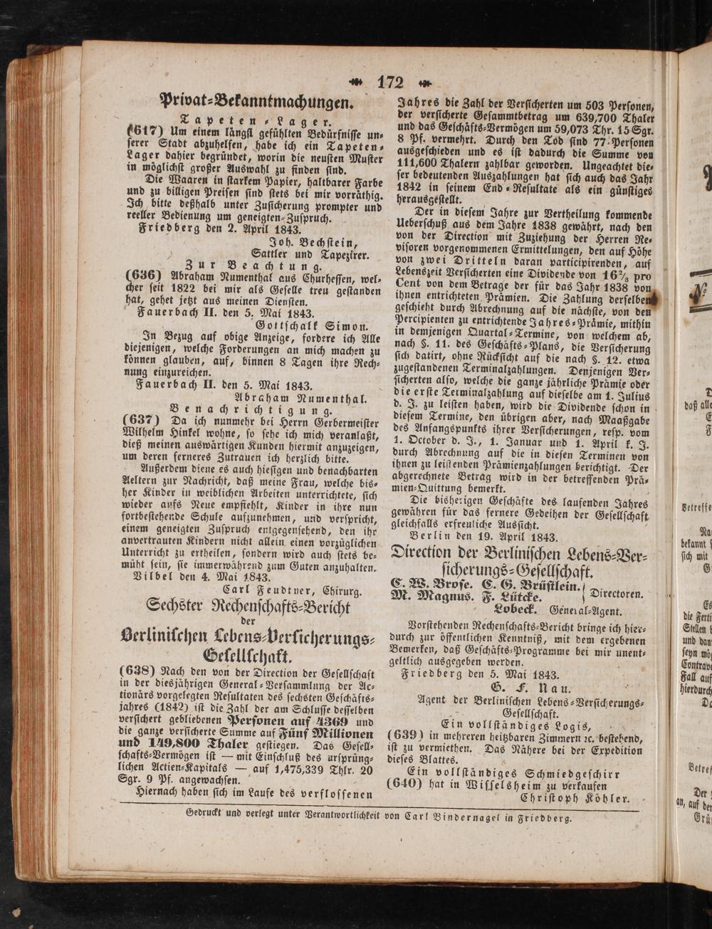 Fauerbach II. den 5. Mai 1843. Abraham Numenthal. Benachrichtigung. (637) Da ich nunmehr bei Herrn Gerbermeiſter Wilhelm Hinkel wohne, ſo ſehe ich mich veranlaßt, dieß meinen auswärtigen Kunden hiermit anzuzeigen, um deren ferneres Zutrauen ich herzlich bitte.
