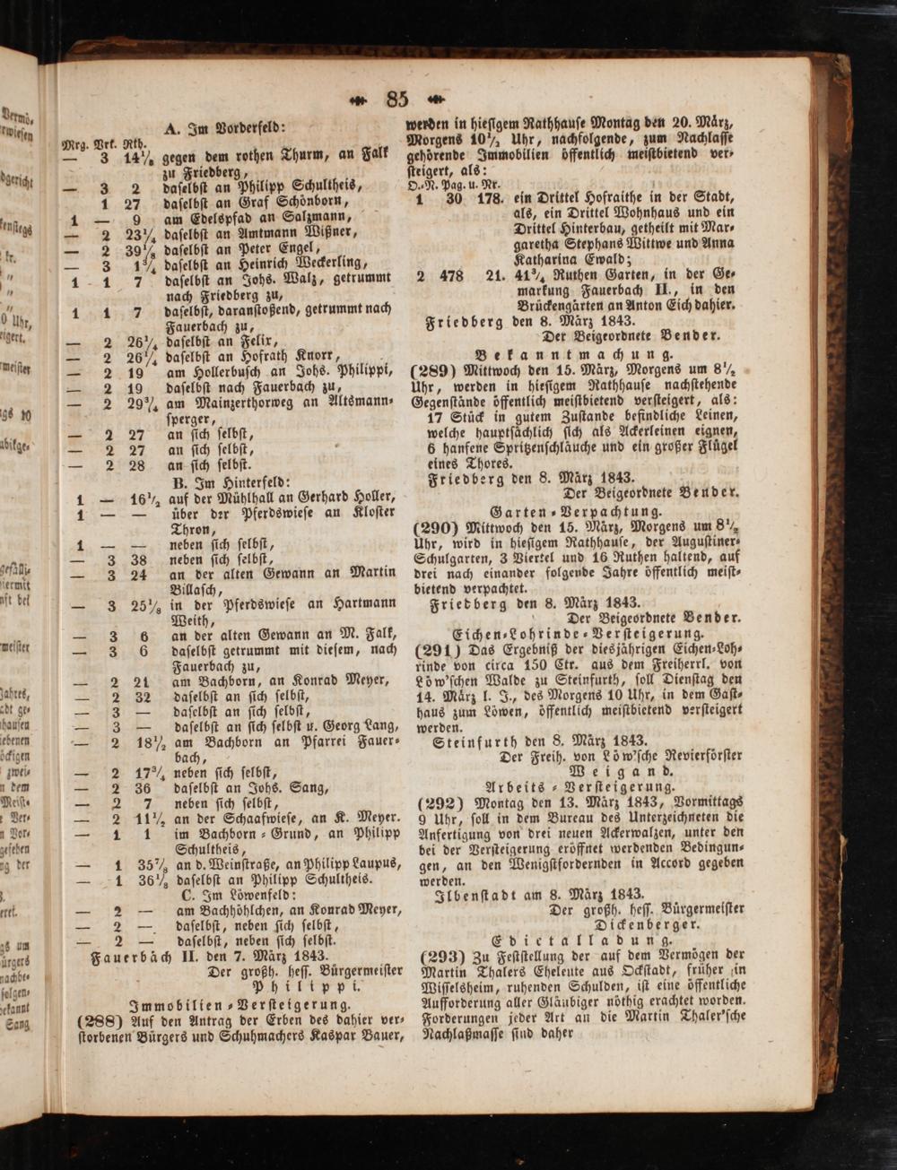 Fauerbäch II. den 7. März 1843. Der großh. heſſ. Buͤrgermeiſter Philippi. Immobilien ⸗Verſteigerung. (288) Auf den Antrag der Erben des dahier ver⸗ ſtorbenen Bürgers und Schuhmachers Kaspar Bauer,
