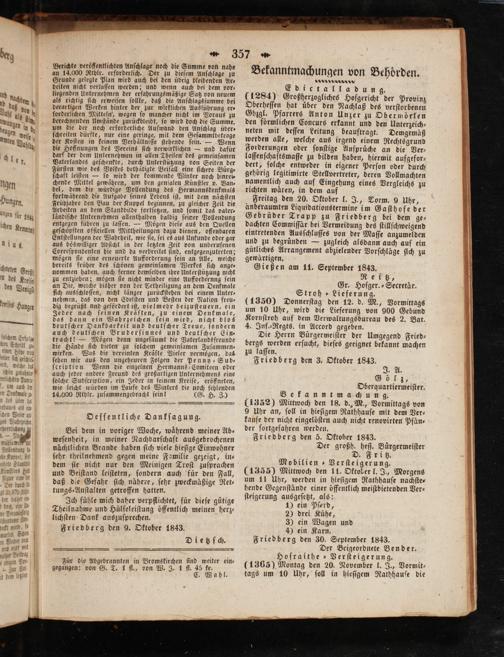 Friedberg den 3. Oktober 1843. J. A. G ö lz, Oberquartiermeiſter. Bekanntmachung. (1352) Mittwoch den 18. d., M., Vormittags von 9 Uhr an, ſoll in hieſigem Rathhauſe mit dem Ver⸗ kaufe der nicht eingelöſten auch nicht renovirten Pfän⸗ der fortgefahren werden. Friedberg den 5. Oktober 1843. Der großh. heſſ. Bürgermeiſter D. Fritz. Mobilien-Verſteigerung. (1355) Mittwoch den 11. Oktober l. J., Morgens um 11 Uhr, werden in hieſigem Rathhauſe nachſte— hende Gegenſtände einer öffentlich meiſtbietenden Ver— ſteigerung ausgeſetzt, als: 1) ein Pſerd, 2) drei Kühe, 3) ein Wagen und 4) ein Karn. Friedberg den 30. September 1843.