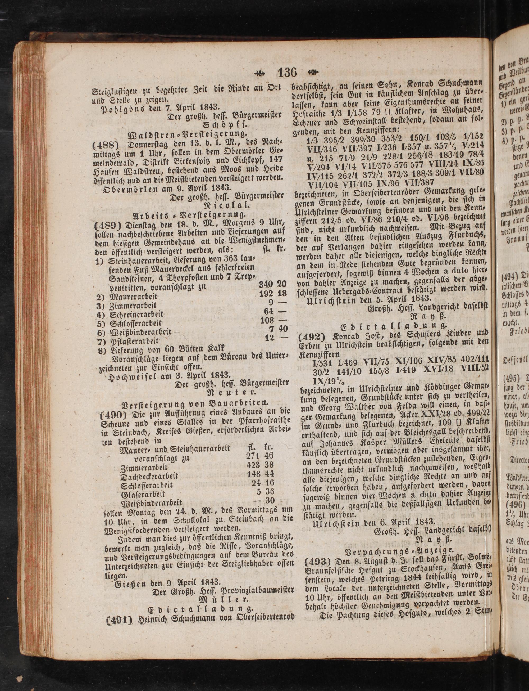 teigluſtigen zu begehrter Zeit die Rinde an Ort und Stelle zu zeigen. Pohlgoͤns den 7. April 1843. Der großh. heſſ. Bürgermeiſter Schöpff. Waldſtreu⸗Verſteigerung. (488) Donnerſtag den 13. d. l. M., des Nach⸗ mittags um 1 Uhr, ſollen in dem Obermörler Ge⸗ meindewald, Diſtrikt Birkenſpitz und Eichkopf, 147 Houfen Waldſtreu, beſtehend aus Moos und Heide oͤffentlich und an die Meiſtbietenden verſteigert werden. Obermörlen am 9. April 1843. Der großh. heſſ. Bürgermeiſter Nicolai. Arbeits⸗-Verſteigerung. (489) Dienſtag den 18. d. M., Morgens 9 Uhr, ſollen nachbeſchriebene Arbeiten und Lieferungen auf dem hieſigen Gemeindehaus an die Wenigſtnehmen⸗ den öffentlich verſteigert werden, als: fl. kr. 10 Steinhauerarbeit, Lieferung von 363 lau⸗ fenden Fuß Mauerdeckel aus fehlerfreien Sandſteinen, 4 Thorpfoſten und 7 Trep⸗
