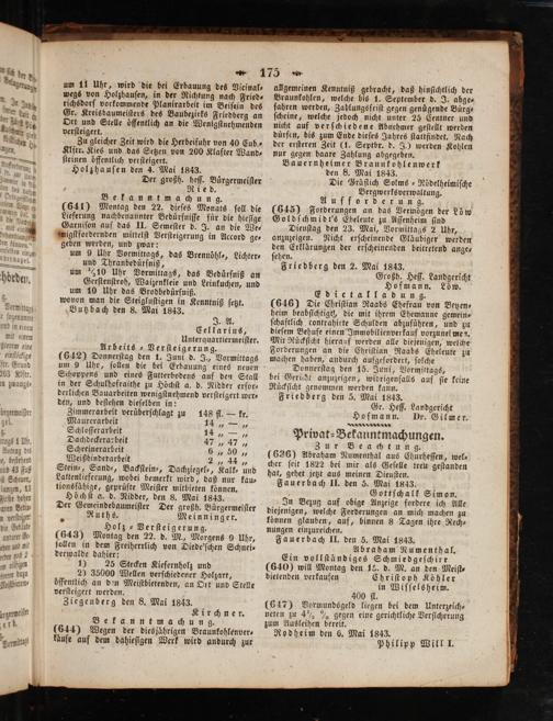 allgemeinen Kenntniß gebracht, daß hinſichtlich der Braunkohlen, welche bis 1. September d. J. abge⸗ fahren werden, Zahlungsfriſt gegen genügende Bürg⸗ ſcheine, welche jedoch nicht unter 25 Centner und nicht auf verſchiedene Abnehmer geſtellt werden dürfen, bis zum Ende dieſes Jahres ſtattfindet. Nach der erſteren Zeit(1. Septbr. d. J.) werden Kohlen nur gegen baare Zahlung abgegeben. Bauernheimer Braunkohlenwerk den 8. Mai 1843. Die Bräflich Solms-Rödelheimiſche Bergwerksverwaltung. A u ffoer denrün (645) Forderungen an das Vermoͤgen der Lö w Goldſchmidt's Eheleute zu Aſſenheim ſind Dienſtag den 23. Mai, Vormittags 2 Uhr, anzuzeigen. Nicht erſcheinende Gläubiger werden den Erklärungen der erſcheinenden beitretend ange— ſehen. Friedberg den 2. Mai 1843. Großh. Heſſ. Landgericht Hofmann. Löw. Edictalladung. (646) Die Chriſtian Raabs Ehefrau von Beyen⸗ heim beabſichtigt, die mit ihrem Ehemanne gemein⸗ ſchaftlich contrahirte Schulden abzuführen, und zu dieſem Behufe einen Immobilienverkauf vorzunel men. Mit Rückſicht hierauf werden alle diejenigen, welche Forderungen an die Chriſtian Raabs Eheleute zu machen haben, andurch aufgefordert, ſolche Donnerſtag den 15. Juni, Vormittags, bei Gericht anzuzeigen, widrigenfalls auf ſie keine Rückſicht genommen werden kann. Friedberg den 5. Mai 1843. Gr. Heſſ. Landgericht Hofmann. Dr. Gilmer. Privat⸗ Bekanntmachungen. Zur Beachtung. (636) Abraham Numenthal aus Churheſſen, wel— cher ſeit 1822 bei mir als Geſelle treu geſtanden hat, gehet jetzt aus meinen Dienſten. Fauerbach II. den 5. Mai 1843. Gottſchalk Simon. In Bezug auf obige Anzeige fordere ich Alle diejenigen, welche Forderungen an mich machen zu können glauben, auf, binnen 8 Tagen ihre Rech⸗ nungen einzureichen. Fauerbach II. den 5. Mai 1843. Abraham Numenthal. Ein vollſtändiges Schmiedgeſchirr (640) will Montag den 15. d. M. an den Meiſt⸗ bietenden verkaufen Chriſtoph Köhler in Wiſſelsheim. 400 fl. (647) Vormundsgeld liegen bei dem Unterzeich⸗ neten zu 4%% gegen eine gerichtliche Verſicherung zum Ausleihen bereit. Rodheim den 6. Mai 1843. Philipp Will J.