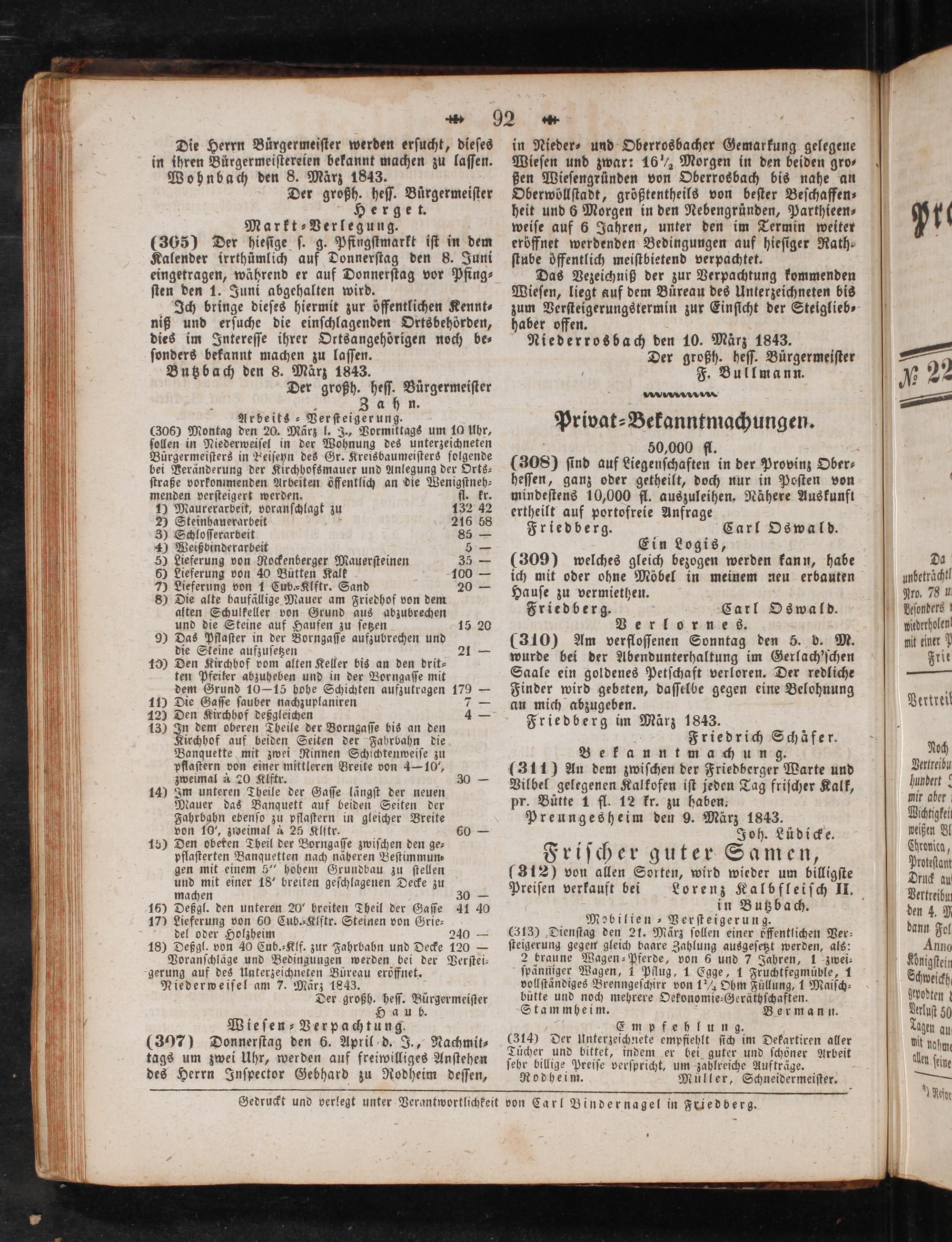 Arbeits ⸗Verſteigerung. (306) Montag den 20. März l. J., Vormiktags um 10 Uhr, ſollen in Niederweiſel in der Wohnung des unterzeichneten Bürgermeiſters in Beiſeyn des Gr. Kreisbaumeiſters folgende bei Veränderung der Kirchhofsmauer und Anlegung der Orts⸗ ſtraße vorkommenden Arbeiten öffentlich an die Wenigſtneh⸗ menden verſteigert werden. fl. kr