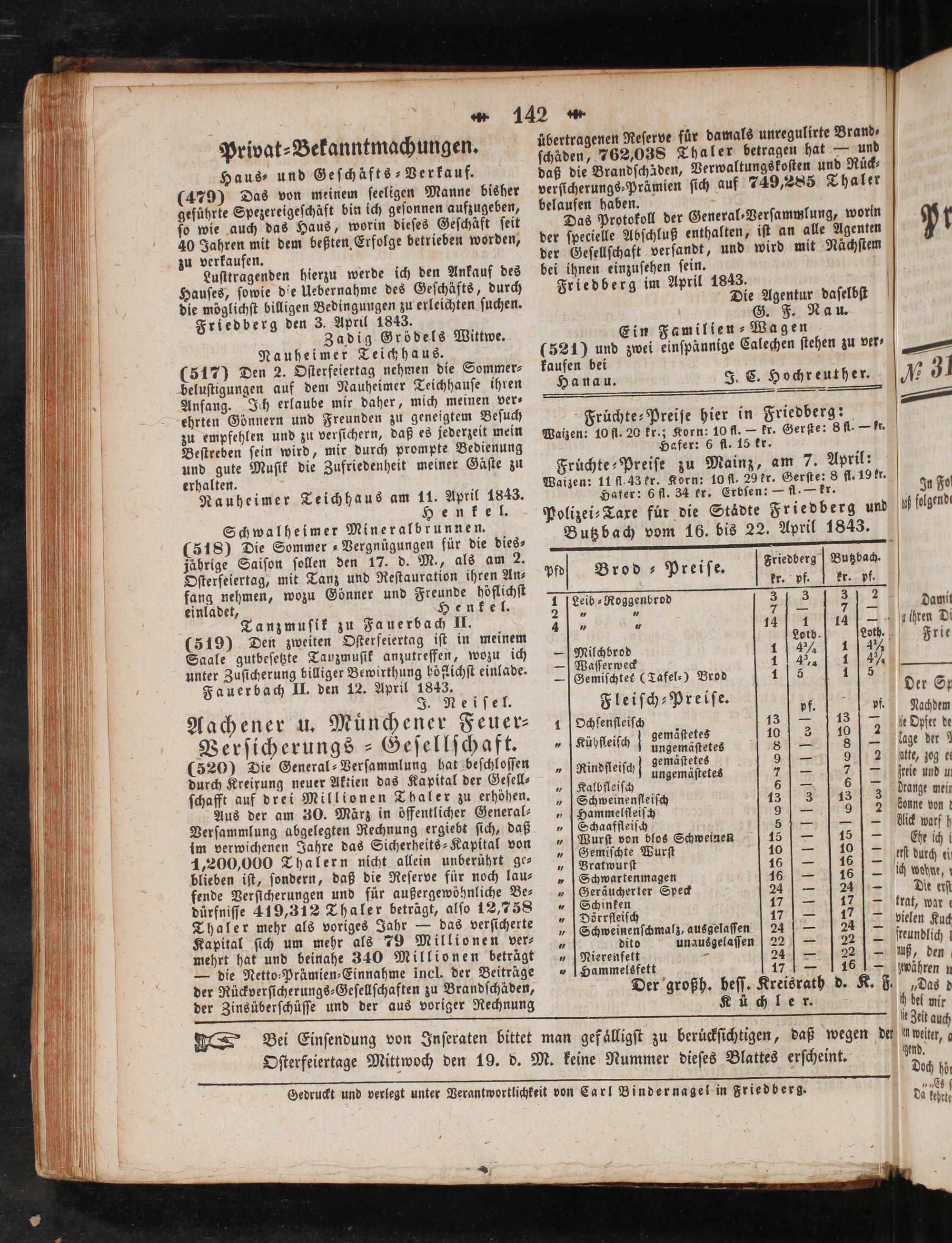 jährige Saiſon ſollen den 17. d. M., als am 2. 5 i Oſterfeiertag, mit Tanz und Reſtauration ihren An⸗ pfdop Brod⸗ Preiſe. N fang nehmen, wozu Gönner und Freunde hö flichſt i Er. einladet, Henkel. 1 JLeib⸗Roggenbrod e Damit Tanzmuſik zu Fauerbach II. 4 5 3 10 91 0— hren Di (519) Den zweiten Oſterfeiertag iſt in meinem A Lotv. Lob. Frie Saale gutbeſetzte Tauzmuſik anzutreffen, wozu ich— Milchbrod 1 unter Zuſicherung billiger Bewirthung böflichſt einlade.— Waſſerweck 14. 14“—— Fauerbach II. den 12. April 1848.—Gemiſchtee(Tafel.) Brod dee 6 b J. Neiſel. Fleiſch⸗Preiſe. f 9 a Aachener u. Muͤnchener Feuer⸗ 1 chenſteiſch 5 29* 4 2* 2 5 3 3 8 Verſicherungs⸗ Geſellſchaft.»useich] angemaetes 3 8 2 lage der 1 (520) Die General- Verſammlung hat beſchloſſen Rindſleiſa gemäſtetes 9— 92 Atte, zog et durch Kreirung neuer Aktien das Kapital der Geſell⸗ 4% ungemäſtetes 7— ie und u ſchafft auf drei Millionen Thaler zu erhöhen. Siehe 10 1 755 3 3 Diange weit Aus der am 30. März in öffentlicher General 0 Boer ee 5 5 5 2 Lonne von! Verſammlung abgelegten Rechnung ergiebt ſich, daß Schaaffleiſch 5——[ dick warf h im verwichenen Jahre das Sicherheits-Kapital von„ Wurst von blos Schweinen 15— 15— Efe ich 1,200,000 Thalern nicht allein unberührt ge-„ Gemiſchte Wurſt 10— 12 nf durch eit blieben iſt, ſondern, daß die Reſerve für noch lau⸗ 5 e 10 25 18— ich wohne, fende Verſicherungen und für außergewöhnliche Be-„ Geräucherter Speck 24— 24— Die tis durfniſſe 419,312 Thaler beträgt, alſo 12,758 Schinken 17 17% ttat 85 Thaler mehr als voriges Jahr— das verſicherte„ Dörrfleiſch i 17[ vielen Kut Kapital ſich um mehr als 79 Millionen ver⸗„ Sache u ee 5 2 3— ſteundlich! mehrt hat und beinahe 340 Millionen beträgt„ Nierenfett 5 8 5 2 5 uß 9 1 Netto⸗Prämien⸗Einnahme incl. der Beiträge Hammelsfett 17 16 währen 1 0 e en e zu Brandſchäden, Der großh. beſſ. Kreisrath d. K. 5.„Das d er Zinsüberſchüſſe und der aus voriger Rechnung Küchler. 0 mir 8 8 ö e Zeit a Bei Einſendung von Inſeraten bittet man gefaͤlligſt zu beruͤckſichtigen, daß wegen des Abc, Oſterfeiertage Mittwoch den 19. d. M. keine Nummer dieſes Blattes erſcheint. 1 och hot