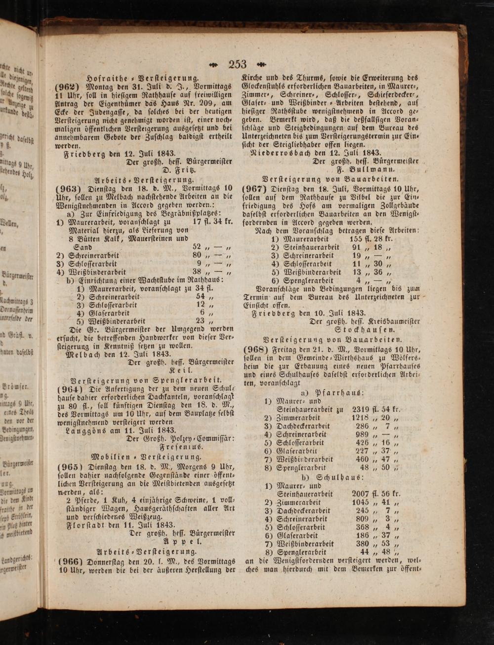 Hofraithe-Verſteigerung. (962) Montag den 31. Juli d. J., Vormittags 11 Uhr, ſoll in hieſigem Rathhauſe auf freiwilligen Antrag der Eigenthümer das Haus Nr. 209, am Ecke der Judengaſſe, da ſolches bei der heutigen Verſteigerung nicht genehmigt worden iſt, einer noch— maligen öffentlichen Verſteigerung ausgeſetzt und bei annehmbarem Gebote der Zuſchlag baldigſt ertheilt werden. Friedberg den 12. Juli 1843. N Der großh. heſſ. Bürgermeiſter f D. Fritz. Arbeits-Verſteigerung. (963) Dienſtag den 18. d. M., Vormittags 10 Uhr, ſollen zu Melbach nachſtehende Arbeiten an die Wenigſtnehmenden in Accord gegeben werden:: a) Zur Einfriedigung des Begräbnißplatzes: