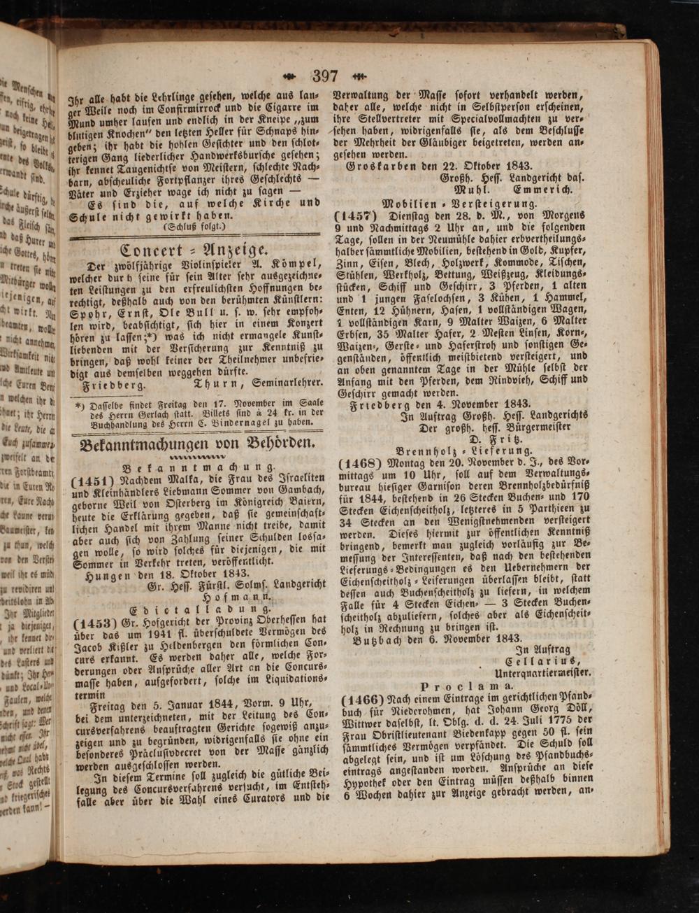 Verwaltung der Maſſe ſofort verhandelt werden, daher alle, welche nicht in Selbſtperſon erſcheinen, ihre Stellvertreter mit Specialvollmachten zu ver⸗ ſehen haben, widrigenfalls ſie, als dem Beſchluſſe der Mehrheit der Gläubiger beigetreten, werden an⸗ geſehen werden. Groskarben den 22. Oktober 1843. Großh. Heſſ. Landgericht daſ. Muhl. Emmerich. Mobilien ⸗Verſteigerung. (1457) Dienſtag den 28. d. M., von Morgens 9 und Nachmittags 2 Uhr an, und die folgenden Tage, ſollen in der Neumühle dahier erbvertheilungs⸗ halber ſämmtliche Mobilien, beſtehend in Gold, Kupfer, Zinn, Eiſen, Blech, Holzwerk, Kommode, Tiſchen, Stühlen, Werkholz, Bettung, Weißzeug, Kleidungs⸗ ſtücken, Schiff und Geſchirr, 3 Pferden, 1 alten und 1 jungen Faſelochſen, 3 Kühen, 1 Hammel, Enten, 12 Hühnern, Haſen, 1 vollſtändigen Wagen, 1 vollſtändigen Karn, 9 Malter Waizen, 6 Malter Erbſen, 35 Malter Hafer, 2 Meſten Linſen, Korn-, Waizen⸗, Gerſte⸗ und Haferſtroh und ſonſtigen Ge⸗ genſtänden, öffentlich meiſtbietend verſteigert, und an oben genanntem Tage in der Muͤhle ſelbſt der Anfang mit den Pferden, dem Rindvieh, Schiff und Geſchirr gemacht werden. Friedberg den 4. November 1843. In Auftrag Großh. Heſſ. Landgerichts Der großh. heſſ. Bürgermeiſter D. Fritz. Brennholz-Lieferung. (1468) Montag den 20. November d. J., des Vor⸗ mittags um 10 Uhr, ſoll auf dem Verwaltungs⸗ bureau hieſiger Garniſon deren Brennholzbedürfniß für 1844, beſtehend in 26 Stecken Buchen- und 170 Stecken Eichenſcheitholz, letzteres in 5 Parthieen zu 34 Stecken an den Wenigſtnehmenden verſteigert werden. Dieſes hiermit zur öffentlichen Kenntniß bringend, bemerkt man zugleich vorläufig zur Be⸗ meſſung der Intereſſenten, daß nach den beſtehenden Lieferungs⸗-Bedingungen es den Uebernehmern der Eichenſcheitholz-Leiferungen überlaſſen bleibt, ſtatt deſſen auch Buchenſcheitholz zu liefern, in welchem Falle für 4 Stecken Eichen— 3 Stecken Buchen⸗ ſcheitholz abzuliefern, ſolches aber als Eichenſcheit⸗ holz in Rechnung zu bringen iſt. Butzbach den 6. November 1843. In Auftrag Cellarius, Unterqnartiermeiſter. Pro cla ma. (1466) Nach einem Eintrage im gerichtlichen Pfand⸗ buch für Niederohmen, hat Johann Georg Döll, Wittwer daſelbſt, lt. Oblg. d. d. 24. Juli 1775 der Frau Obriſtlieutenant Biedenkapp gegen 50 fl. ſein ſämmtliches Vermoͤgen verpfändet. Die Schuld ſoll abgelegt ſein, und iſt um Löſchung des Pfandbuchs⸗ eintrags angeſtanden worden. Anſprüche an dieſe Hypothek oder den Eintrag müſſen deßhalb binnen 6 Wochen dahier zur Anzeige gebracht werden, an⸗