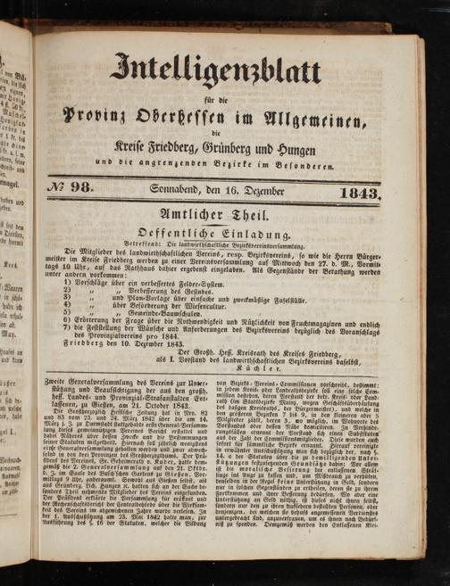 don 1 ul. 1 ſich 9 Aguen, ö 9 1 110er für die 90 kr* asc p Oberbeſſen im Al B N cel. 3 a rovin erbeſſen im emeinen, **. in die . bis 7. e At e Kreiſe Friedberg, Gruͤnberg und Hungen 18 im und die angrenzenden Bezirke im Beſonderen. del. und A. 2 Ww. We rnagel 8 93. Sonnabend, den 16. Dezember 1843. daten und— e eben. a Amtlicher Theil. U ſeit dem 1 2 N 2 n dune, Oeffentliche Einladung. de hiermit Betreffend: Die landwirthſchaftliche Bezirksvereinsverſammlung. Die Mitglieder des landwirthſchaftlichen Vereins, resp. Bezirksvereins, ſo wie die Herrn Buͤrger⸗ meiſter im Kreiſe Friedberg werden zu einer Vereinsverſammlung auf Mittwoch den 27. d. M., Vormit⸗ Kees e e d Rathhaus dahier ergebenſt eingeladen. Als Gegenſtände der Berathung werden men: 50 1) Vorſchläge über ein verbeſſertes Felder⸗Syſtem. Daaren 29 15„ Verbeſſerung des Geſindes. in ſchö⸗ 30 75 und Plan⸗Vorlage über einfache und zweckmäßige Faſelſtälle. bt ich 4 1 über Beförderung der Wieſencultur. de etdal N„ Gemeinde-Baumſchulen. 1* 6) Erörterung der Frage über die Nothwendigkeit und Nützlichkeit von Fruchtmagazinen und endlich — ab. 7 05 Feſtſtellung der Wuͤnſche und Anforderungen des Bezirksvereins bezuglich des Voranſchlags May. es Provinzialvereins pro 1844. Friedberg den 10. Dezember 1843. dauſts an Der Großh. Heſſ. Kreisrath des Kreiſes Friedberg, ind fan als I. Vorſtand des landwirthſchaftlichen Bezirksvereins daſelbſt, Küchler. Außer Zweite Generalverſammlung des Vereins zur Unter⸗ 15 den eig e eee l n e n N N. in jedem Kreis⸗ oder Landrathsbezirke ſoll eine ſolche Com⸗ uit ſtützung 1 Beaufſichtigung der aus den großh. miſſion beſtehen, deren Vorſtand der betr. Kreis⸗ oder Land⸗ 4 heſſ. Landes⸗ und Provinzial⸗Strafanſtalten Ent⸗ rath(im Stadtb Mai iftsüberba t ſich be⸗ J m Stadtbezirke Mainz wegen Geſchäftsüberhaͤufung 1 4 laſſenen, zu Gießen, am 21. October 1843. des daſigen Kreisraths, der Bürgermeiſter), und welche in ad welche Die Großherzoglich Heſſiſche Zeitung hat in Nro. 82 den größeren Bezirken 7 bis 9, in den kleineren aber 5 en, habe und 83 vom 23. und 24. März 1842 über die am 14. Mitglieder zählt, deren 3, wo möglich, im Wohnorte des März J. J. zu Darmſtadt ſtattgehabte erſte General⸗Verſamm⸗ Vorſtandes oder deſſen Nähe domiciliren. In Verhinde⸗ zel! lung dieſes gemeinnützigen Vereines Bericht erſtattet und rungsfällen ernennt der Vorſtand ſich einen Subſtituten 9 ö dabei Näheres über deſſen Zwecke und die Beſtimmungen aus der Zahl der Commiſſionsmitglieder. Dieſe wurden auch 1. ſeiner Statuten mitgetbeilt. Hiernach ſoll jährlich wenigſtens ſofort für ſämmtliche Bezirke ernannt. Hierauf vereinigte einle Generalverſammlung gehalten werden und zwar abwech⸗ in erwähnter Ausſchußſitzung man ſich bezuglich der, nach 9. ſelnd in den drei Provinzen des Großherzogthums. Der Prä⸗ 14. o der Statuten über die zu bewilligenden Unter⸗ Deibnach⸗ ſident des Vereines, Gr. Geheimerath v. Kuder, hatte dem⸗ ſtuͤtzungen feſtzuſetzenden Grundſätze dahin: Vor allem tiwaaret, gemäß die 2. Generalverſammlung auf den 21. Oktör. iſt die moraliſche Beſſerung der entlaſſenen Sträf⸗ 10 d. J. im Saale des Buſch'ſchen Gartens zu Gießen, Vor⸗ linge ins Auge zu faſſen und, um Mißbrauch zu verhüten, Aus wa mittags 9 Uhr, anberaumt. Sowohl aus Gießen ſelbſt, als denſelben in der Regel keine unterſtuͤzung in Geld, ſondern „ Amithe aus Grünberg, Lich, Hungen ꝛc. hatten ſich an der Sache be⸗ nur in ſolchen Gegenſtänden zu ertheilen, deren ſie zu ihrem 10 fall ſonders Theil nehmende Mitglieder des Vereins eingefunden. Fortkommen und ihrer Beſſerung bedürfen. Wo aber eine