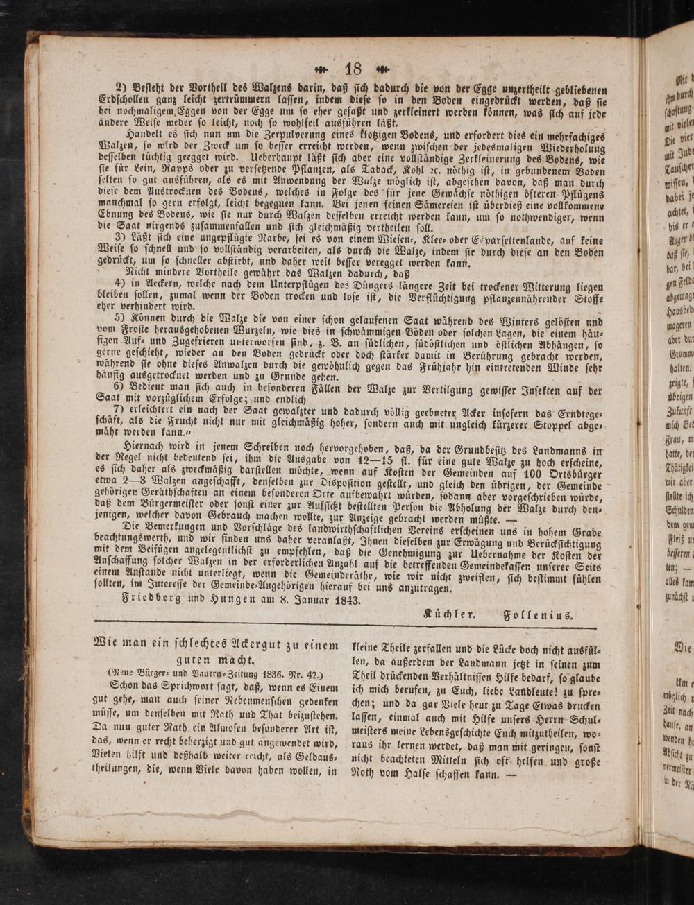 1 18. 2) Beſteht der Vortheil des Walzens darin, daß ſich dadurch die von der Egge unzertheilt gebliebenen Erdſchollen ganz leicht zertrümmern laſſen, indem dieſe ſo in den Boden eingedrückt werden, daß ſie bei nochmaligem Eggen von der Egge um ſo eher gefaßt und zerkleinert werden können, was ſſch auf jede andere Weiſe weder ſo leicht, noch ſo wohlfeil ausführen läßt. 1 b