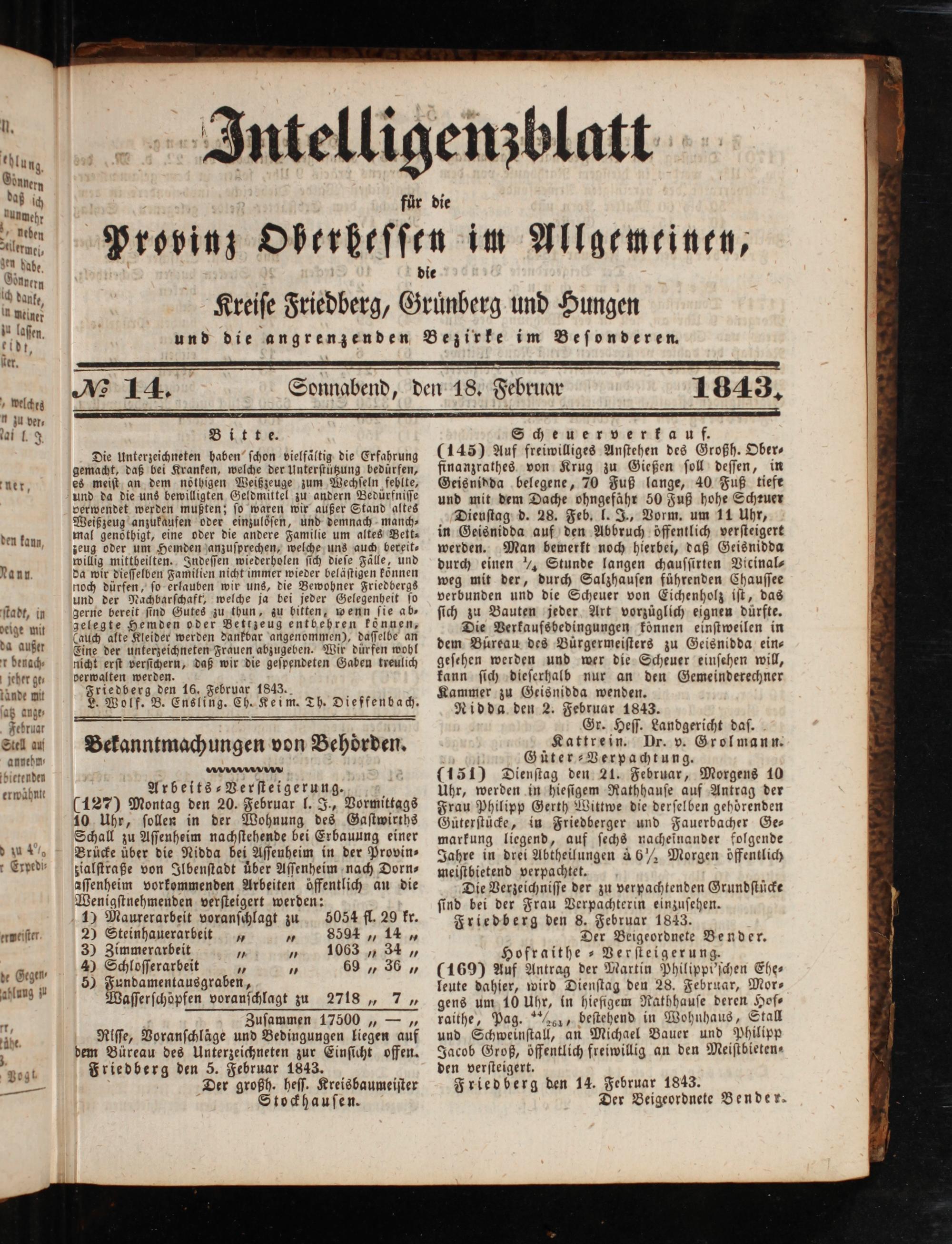 Zuſammen 17500„—„ Riſſe, Voranſchläge und Bedingungen liegen auf dem Büreau des Unterzeichneten zur Einſicht offen. Friedberg den 5. Februar 1843. Der großh. heſſ. Kreisbaumeiſter Stockhauſen.